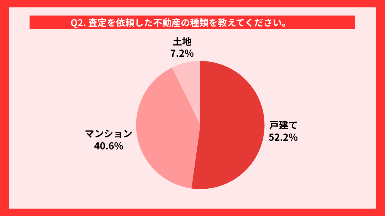 査定を依頼した不動産の種類は、最多が戸建て(52.2%)、次いでマンション(40.6%)と全体の9割以上が住宅物件でした。土地(7.2%)は少数であり、実際の居住用不動産の売却が中心です。