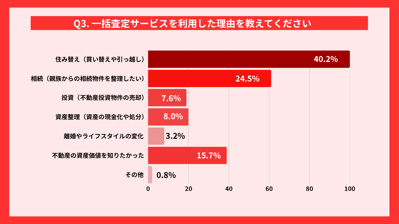 一括査定サービスを利用した理由の中で最も多かったのは、「住み替え(40.2%)」でした。2位の「相続(24.5%)」と合わせると全体の6割を超え、ライフイベントや資産承継に伴う売却が中心のようです。