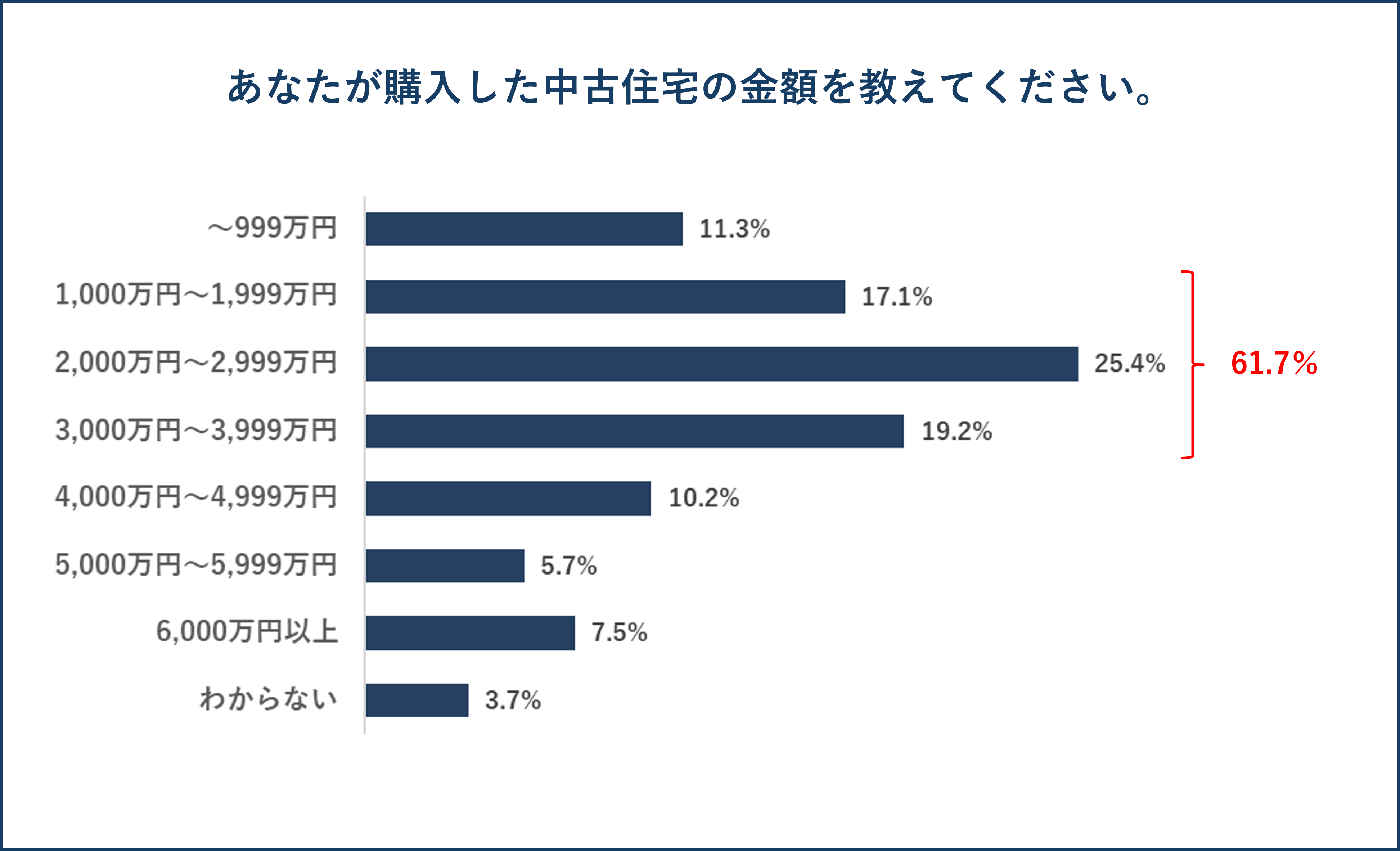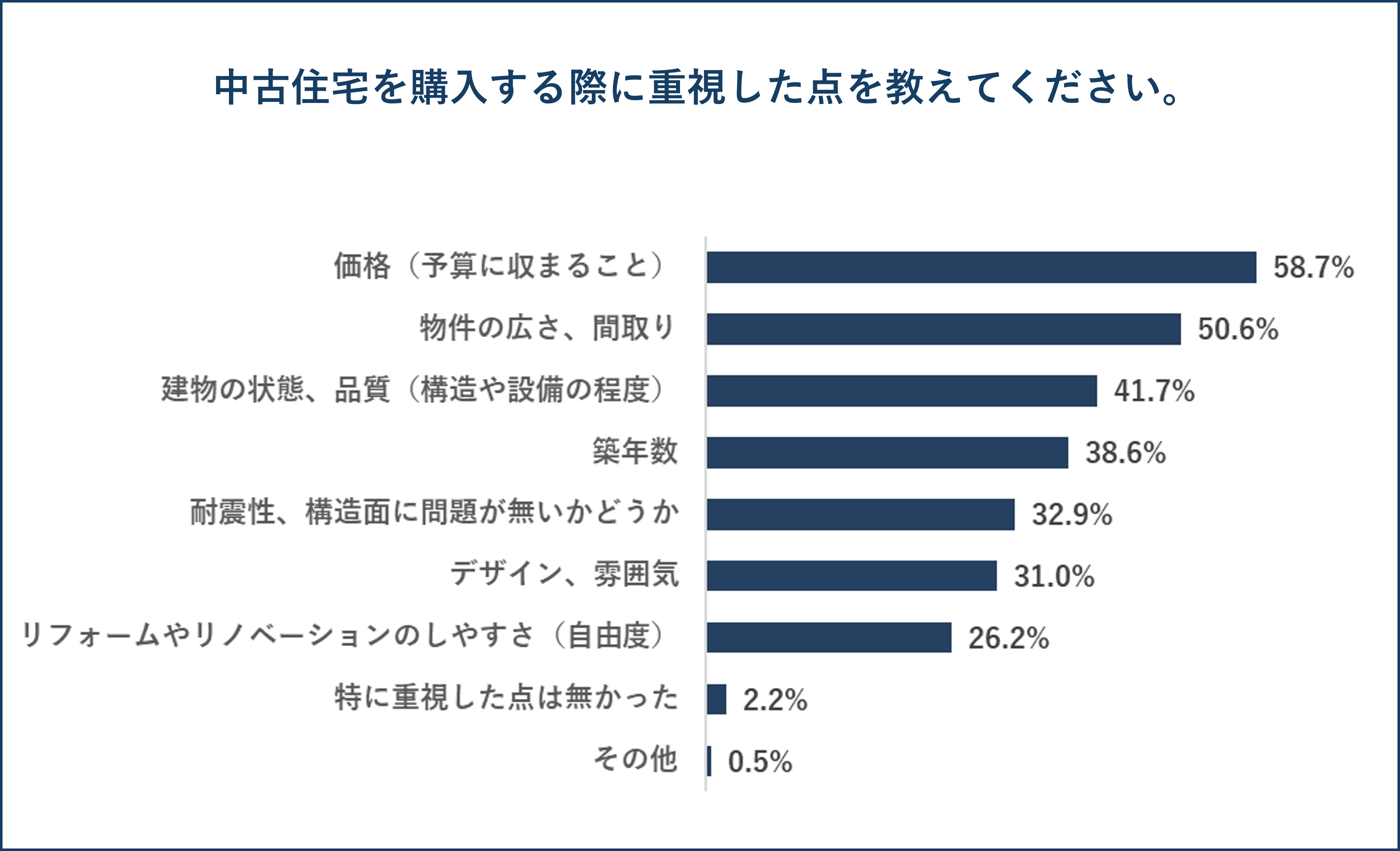中古住宅を購入する際に重視した点を聞いたところ、「価格(予算に収まること)」が58.7%と最も多く、次いで「物件の広さ、間取り」が50.6%、「建物の状態、品質(構造や設備の程度)」が41.7%となっています。約60%の方が「価格(予算に収まること)」を重視している傾向がうかがえます。