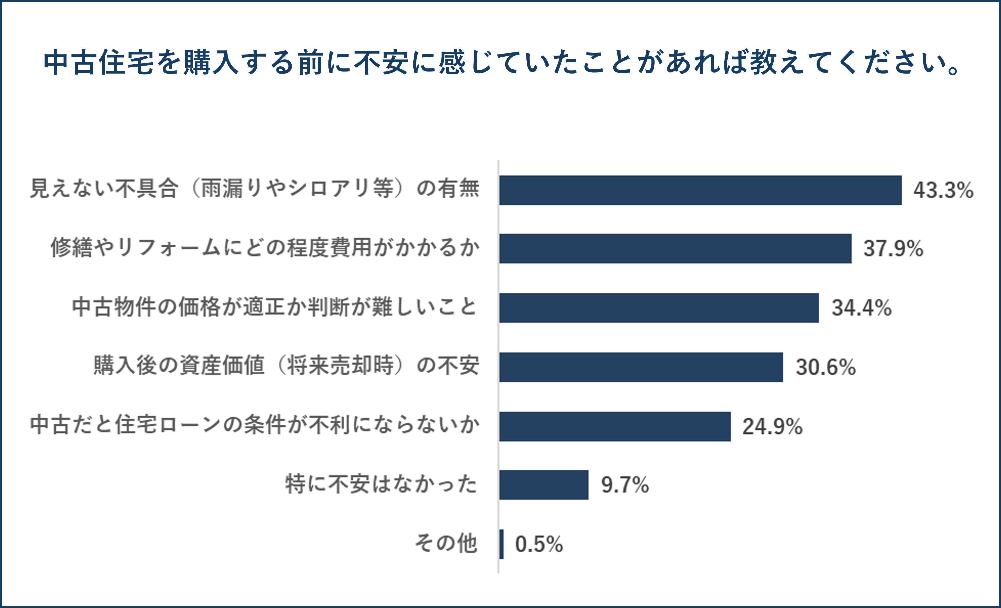 中古住宅を購入する前に不安を感じたことを聞いたところ、「見えない不具合(雨漏りやシロアリ等)の有無」が43.3%と最も多く、「修繕やリフォームにどの程度費用がかかるか」が37.9%、「中古物件の価格が適正か判断が難しいこと」が34.4%となっています。