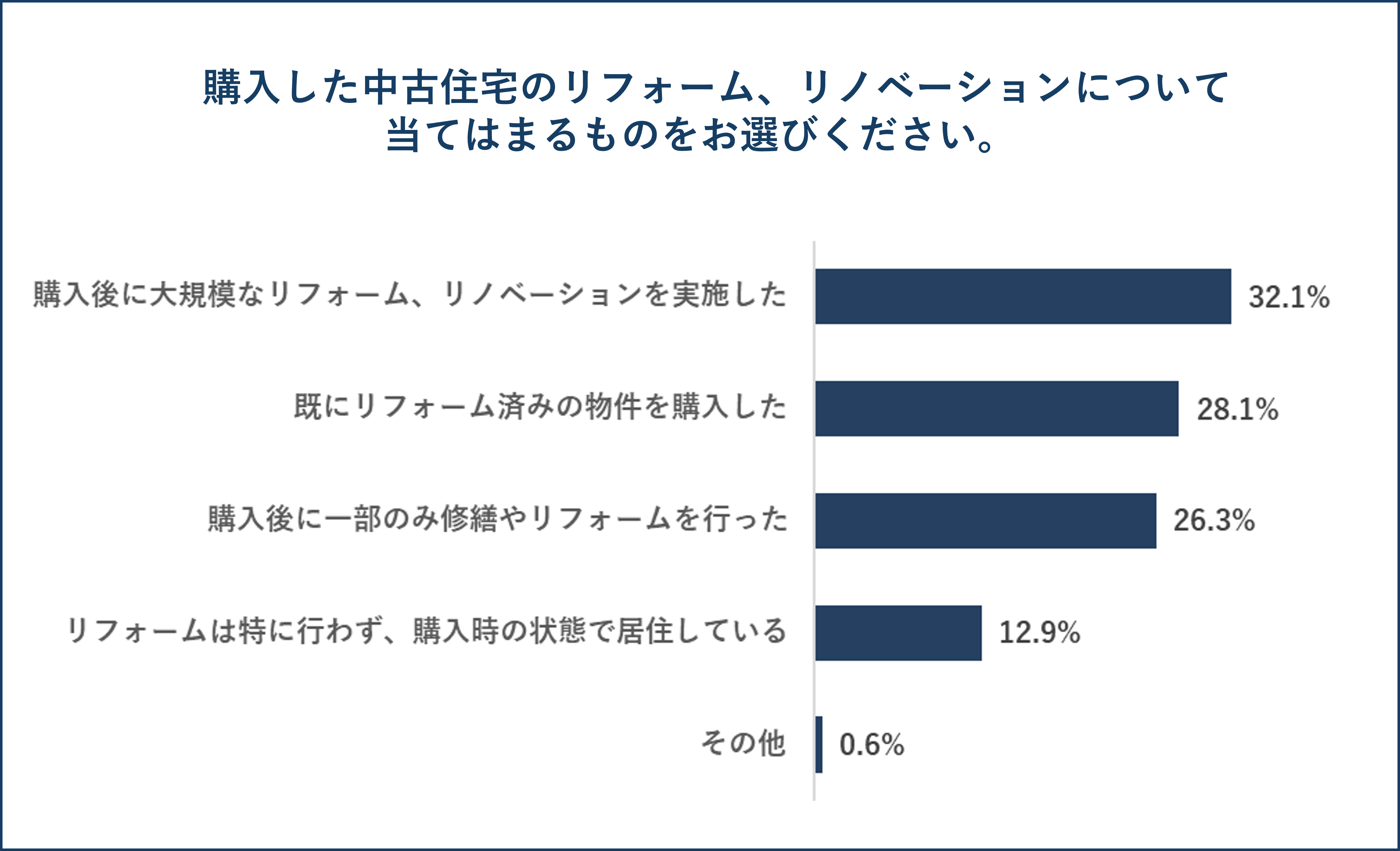 購入した中古住宅のリフォーム、リノベーションについて聞いたところ、「購入後に大規模なリフォーム、リノベーションを実施した」が32.1%、「既にリフォーム済みの物件を購入した」が28.1%、「購入後に一部のみ修繕やリフォームを行った」が26.3%となっています。