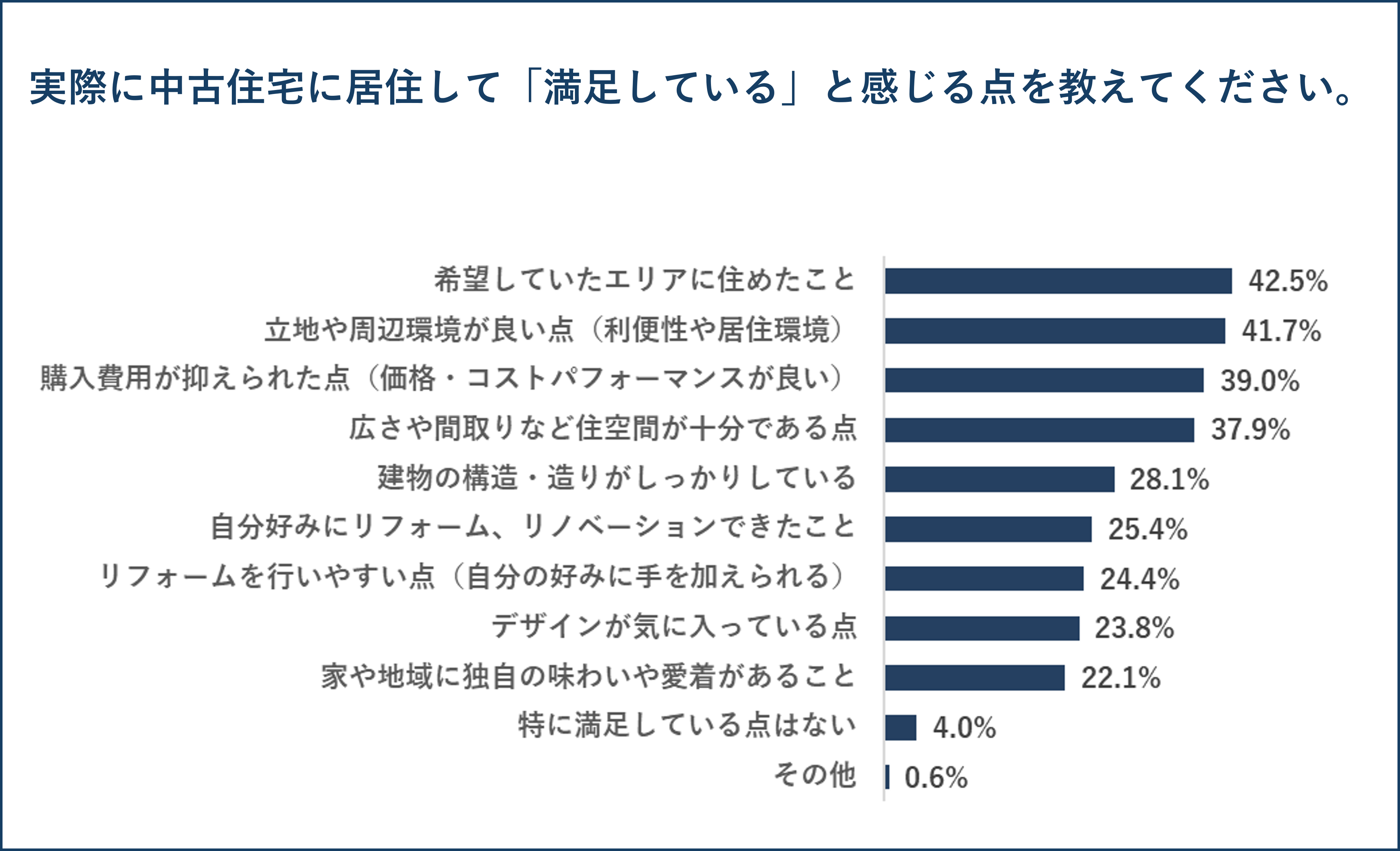 実際に中古住宅に居住して「満足している」と感じる点を聞いたところ、「希望していたエリアに住めたこと」が42.5%と最も多く、次いで「立地や周辺環境が良い点(利便性や居住環境)」が41.7%、「購入費用が抑えられた点(価格・コストパフォーマンスが良い)」が39.0%となっています。