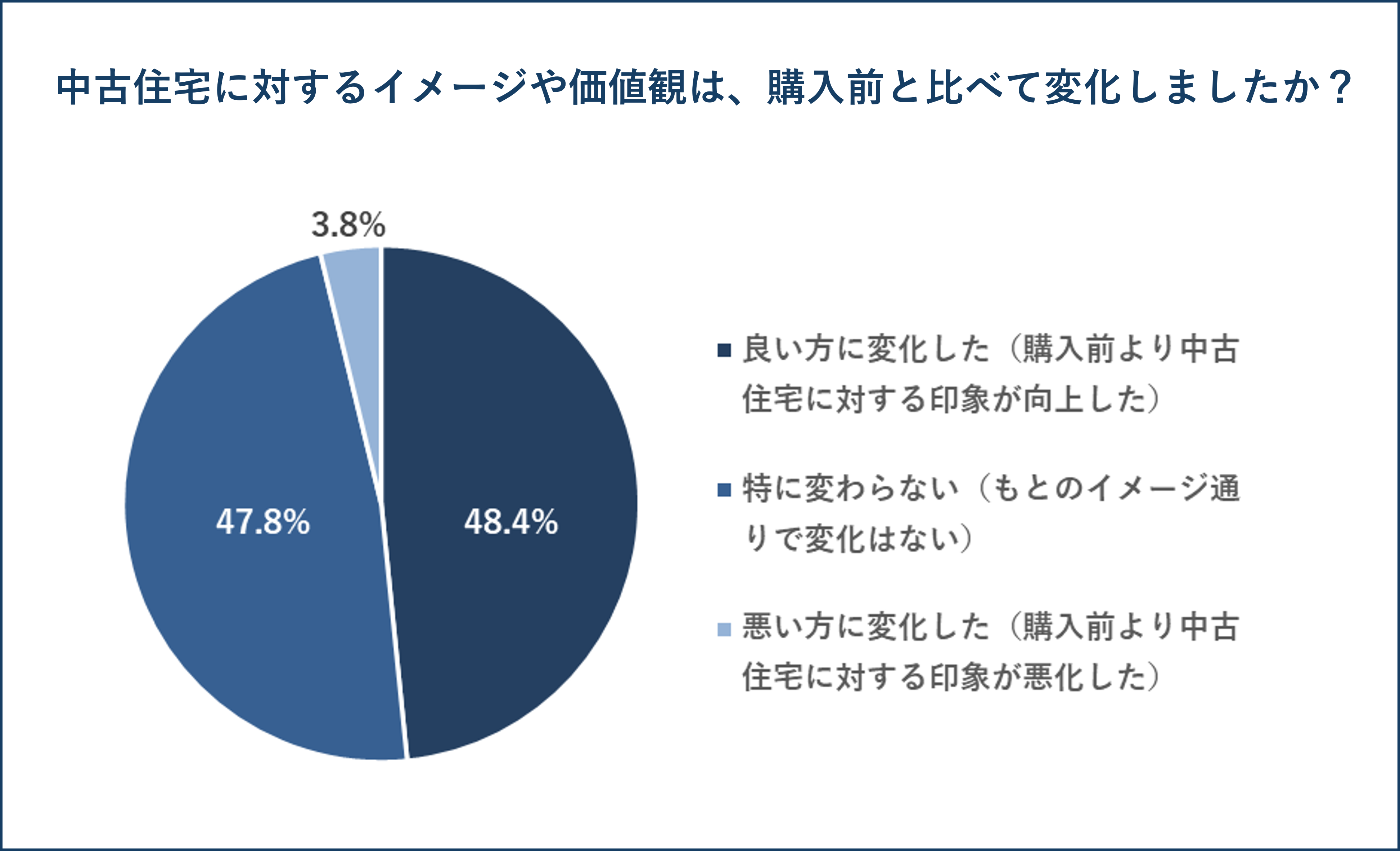中古住宅に対するイメージや価値観が、購入前と比べて変化したかを聞いたところ、「良い方向に変化した(購入前より中古住宅に対する印象が向上した)」が48.4%、「特に変わらない(もとのイメージ通りで変化はない)」が47.8%、「悪い方に変化した(購入前より中古住宅に対する印象が悪化した)」が3.8%となっています。