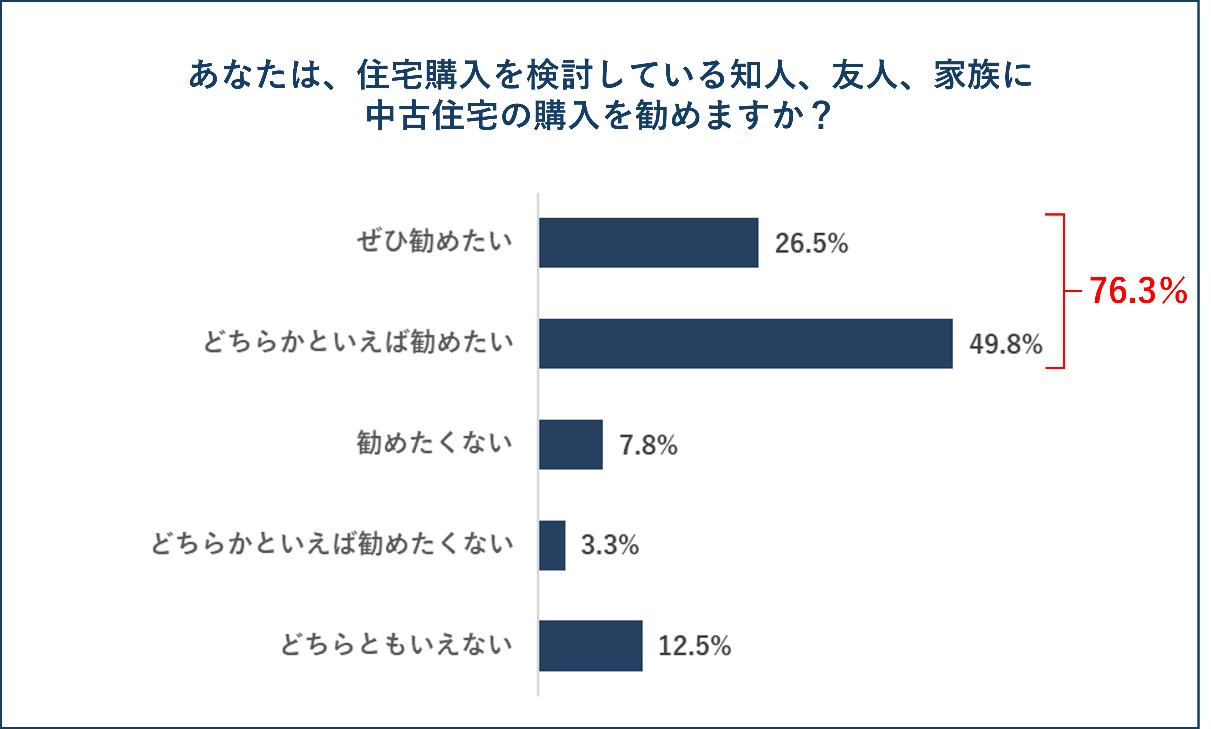 住宅購入を検討している知人、友人、家族に中古住宅の購入を勧めるかと聞いたところ、「ぜひ勧めたい」が26.5%、「どちらかといえば勧めたい」が49.8%と「勧めたい」という回答が76.3%となっています。