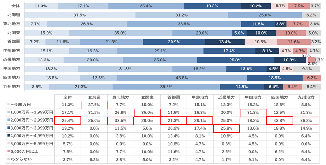 北海道では、「1,000万円未満」が37.5%と最も多くなっており、「3,000万円以上」は0%となっています。北関東(茨城県・栃木県・群馬県)では、「1,000万円台」が35.0%と最も多く、一方で「6,000万円以上」も10.0%と全エリアの中では2番目に多い数値になっています。首都圏(東京都・埼玉県・千葉県・神奈川県)では、「2,000万円台」が21.3%と最も多く、一方で「4,000万円台」が13.4%、「5,000万円台」が10.8%、「6,000万円以上」が11.6%と「4,000万円台以上」の各金額帯で全エリアの中で最も多い数値になっています。近畿では「3,000万円台」が25.8%と最も多く、全エリアの中では近畿のみになっています。四国では、「2,000万円台」が43.8%と全エリアの中で最も多くなっています。このように各エリアによって状況が異なることが見て取れる結果になっています。