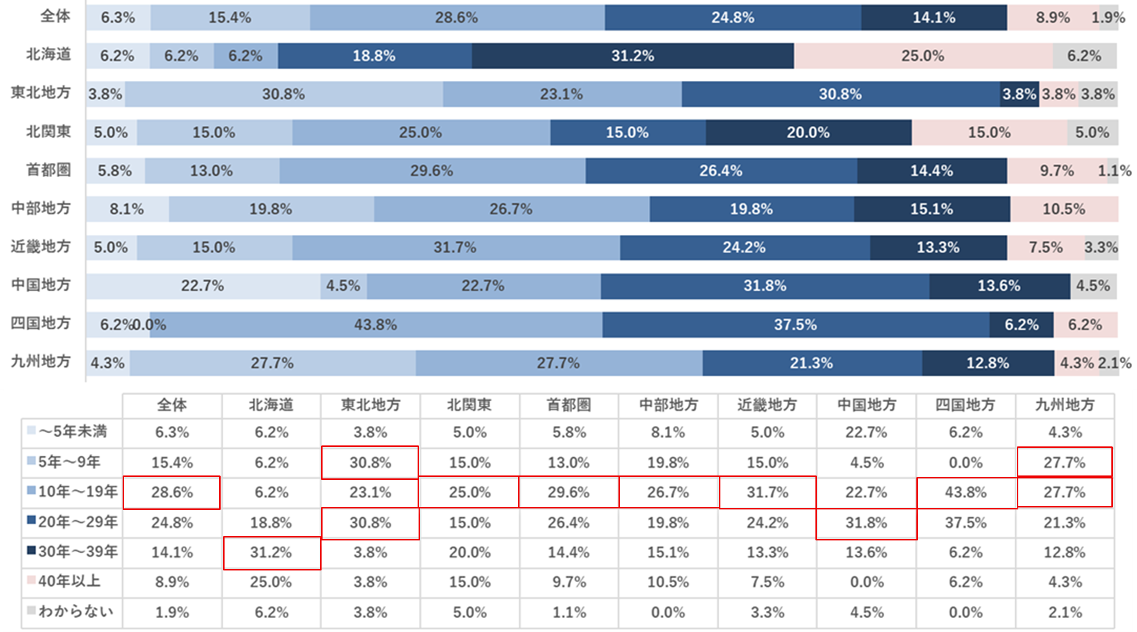 エリアごとに購入した中古住宅の築年数を聞いたところ、全体では「10年台」が28.6%と最も多く、次いで「20年台」が24.8%、「5~9年」が15.4%となっています。ほとんどのエリアで、築年数が30年未満の中古住宅が選ばれている一方、北海道は「30年台」が31.2%、「40年以上」が25.0%と「30年以上」が56.2%を占めており、エリア特性が現れる結果となっています。