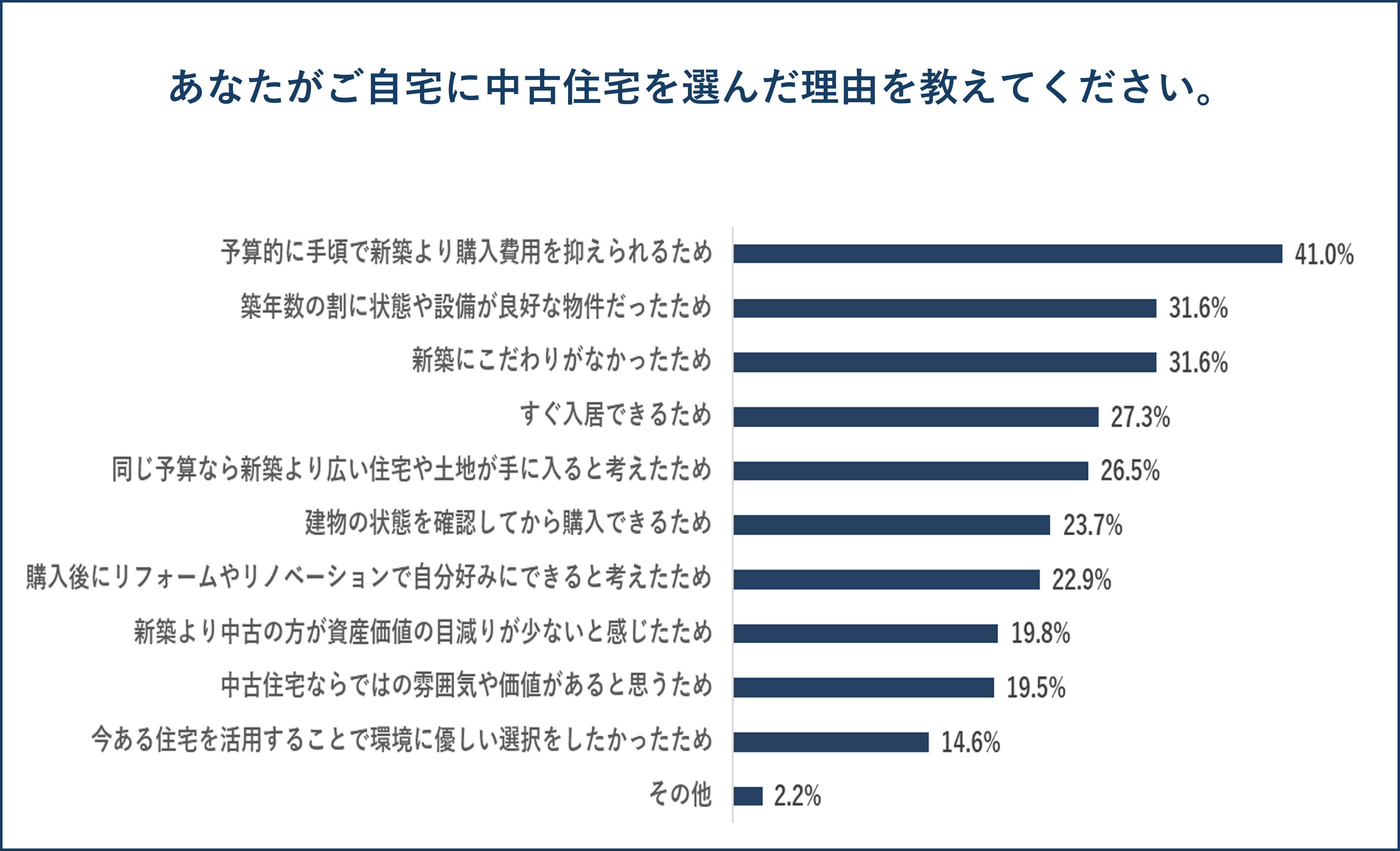自宅に中古住宅を選んだ理由を聞いたところ、「予算的に手頃で新築より購入費用を抑えられるため」が41.0%と最も多く、「築年数の割に状態や設備が良好な物件だったため」と「新築にこだわりがなかったため」が共に31.6%となっています。上位の回答は“費用”や“設備面”など、住宅を選ぶ優先順位が新築という事より、費用面や築年数の割に状態や設備が良好だったなど、“実質的な条件面”の優先度が高い傾向がうかがえ、「新築にこだわりがない」という回答も30%を超える結果になっています。
