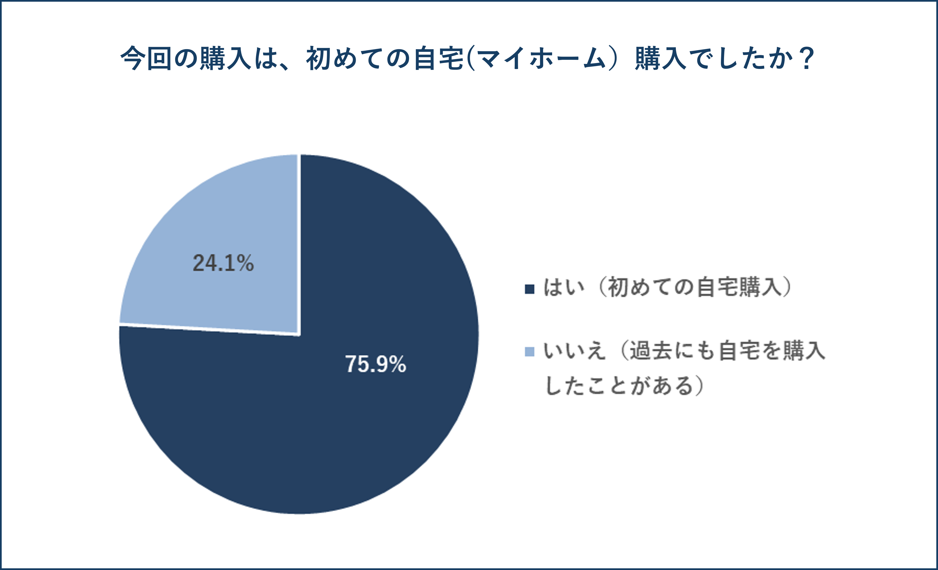 今回の購入は、初めての自宅購入かと聞いたところ、「はい(初めての自宅購入)」が75.9%、「いいえ(過去にも自宅を購入したことがある)」が24.1%という結果になりました。初めて自宅を購入する際でも75%以上の方が中古住宅を選択して購入したことがうかがえます。