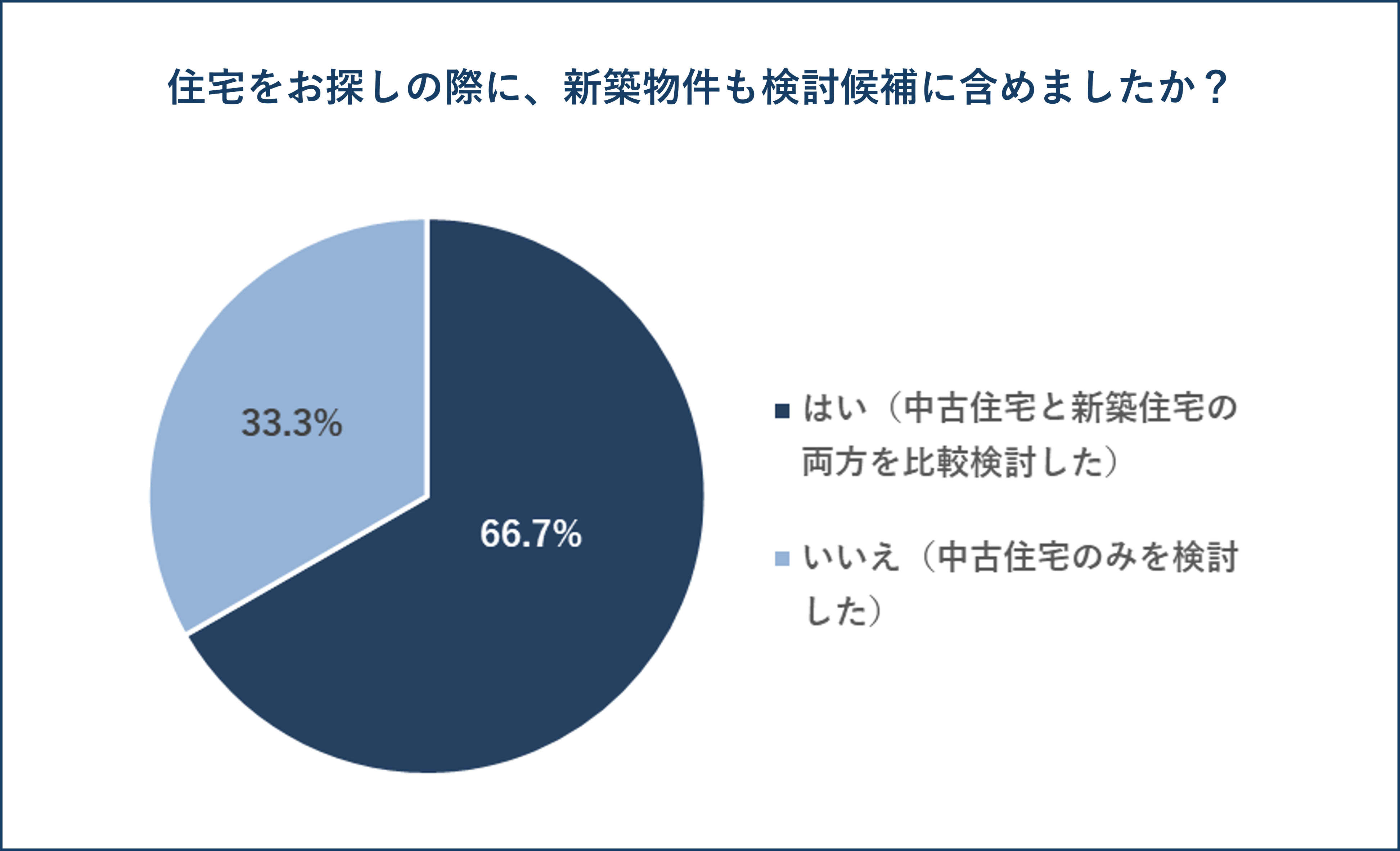 住宅をお探しの際に、新築物件も検討候補に含めたかと聞いたところ、「はい(中古住宅と新築住宅の両方を比較検討した)」という回答が66.7%、「いいえ(中古住宅のみを検討した)」という回答が33.3%と、約3分の1が「中古住宅のみを検討した」という結果になっております。