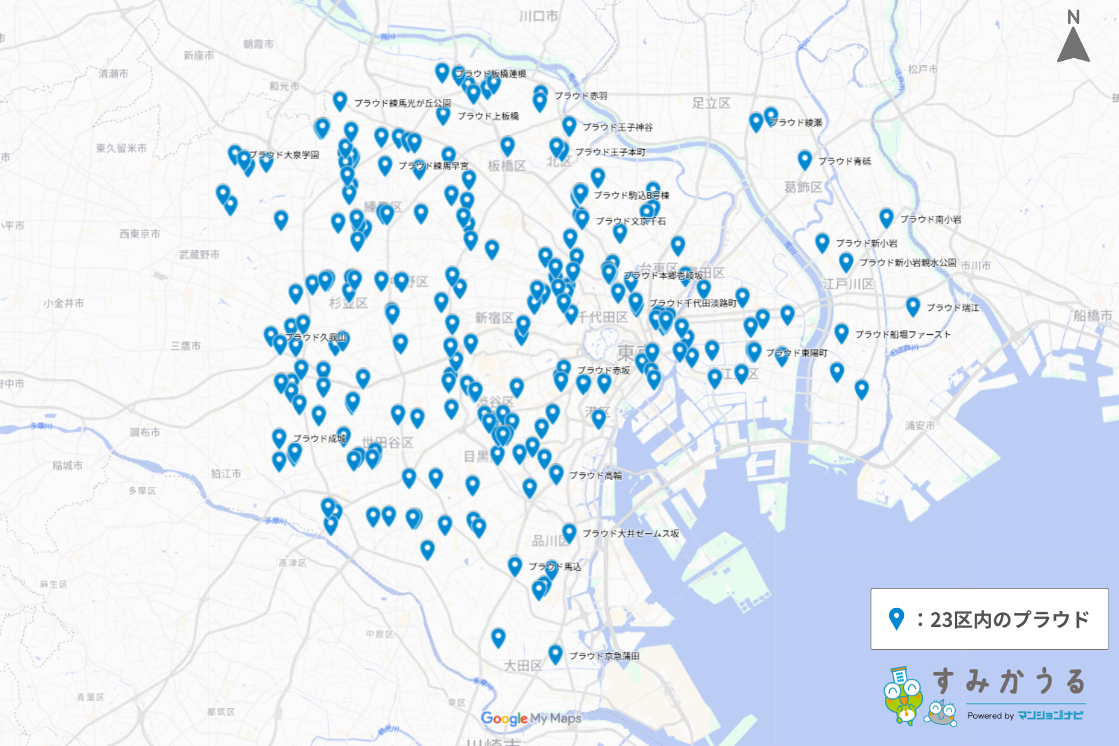 画像1:23区内のプラウド所在(マンションナビ調べ)