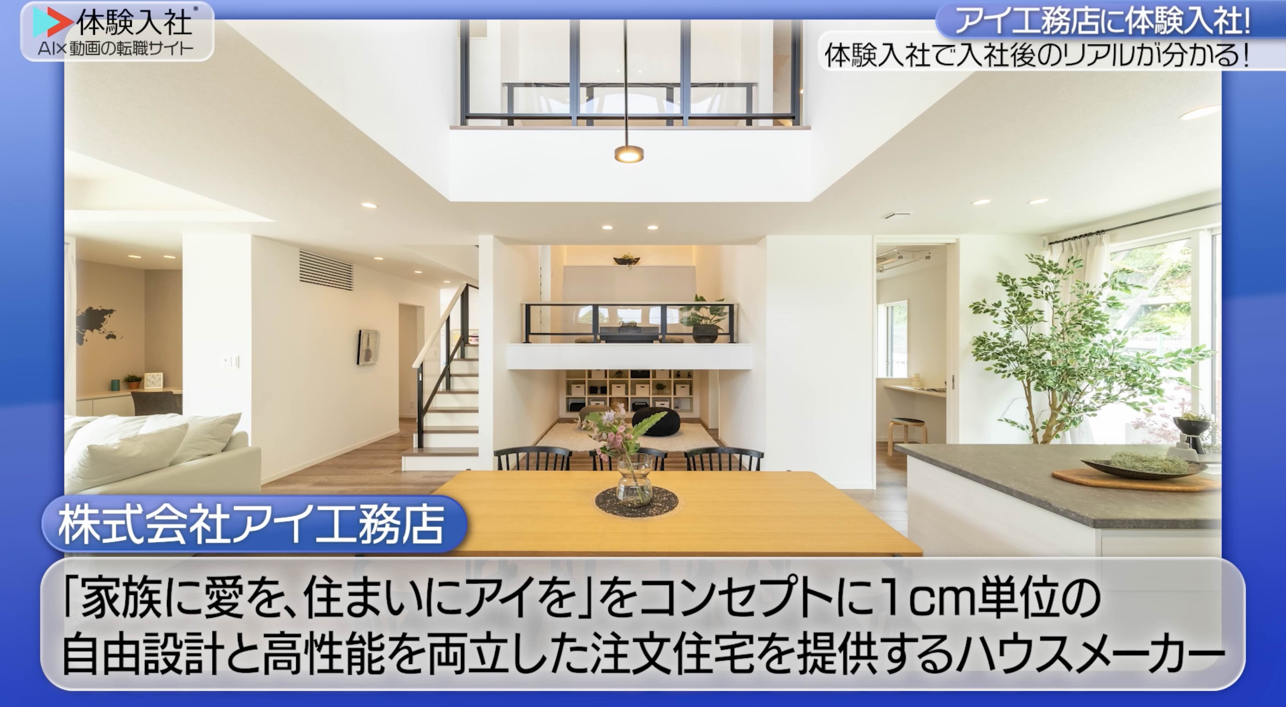 株式会社体験入社(本社:神奈川県鎌倉市、代表取締役:松本聖司)は、この度、注文住宅を提供するハウスメーカーである株式会社アイ工務店(以下、アイ工務店)が、当社の提供する採用動画サービス「体験入社動画」を導入したことをお知らせいたします。この導入は、「入社前には“入社後のリアル”が見えにくい不安」という課題を解消し、アイ工務店が求める「自社にマッチした人材」の獲得をサポートいたします。