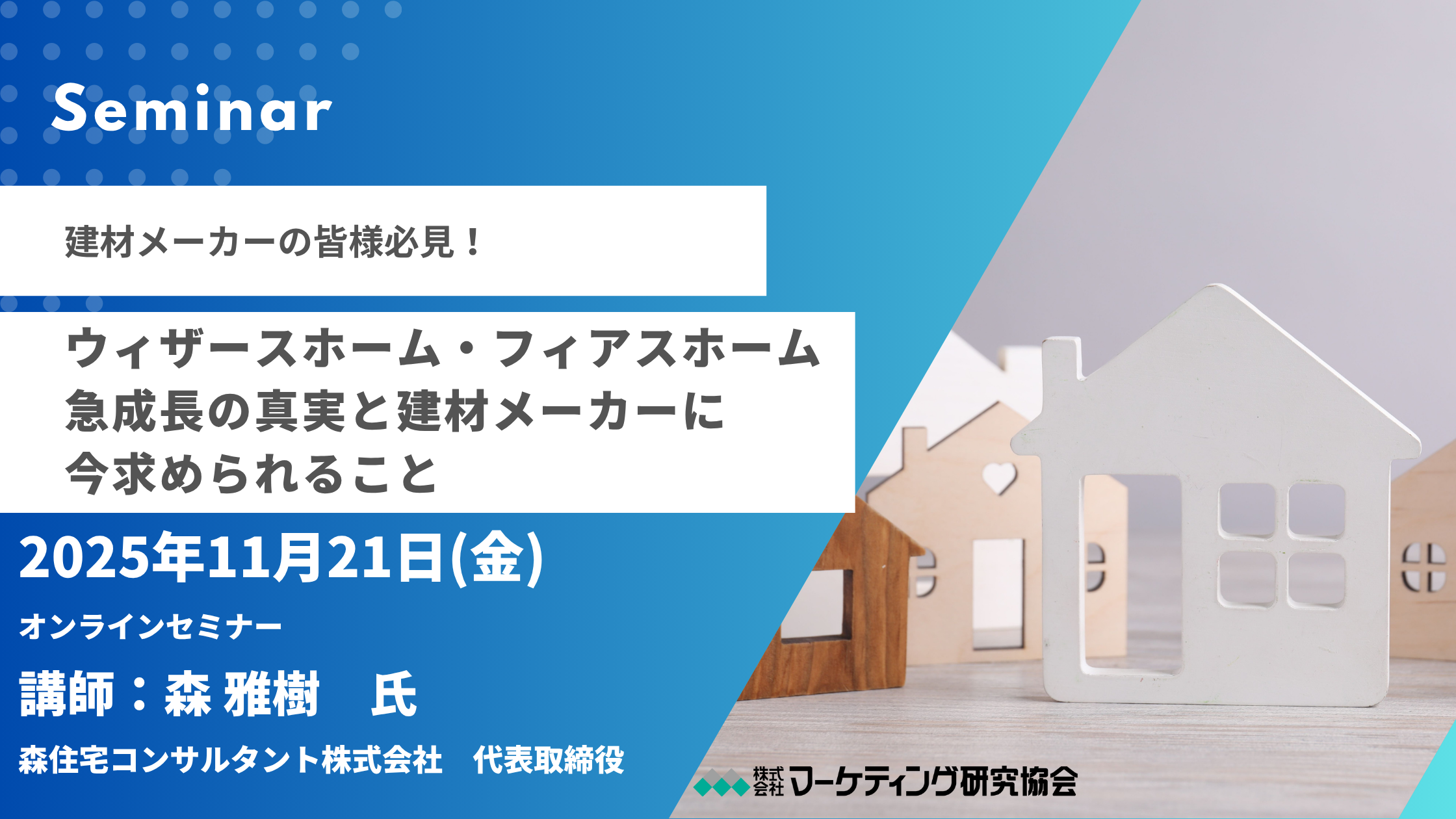 株式会社マーケティング研究協会は、2025年11月21日オンラインセミナー「ウィザースホーム・フィアスホーム急成長の真実と建材メーカーに今求められること」を開催します。