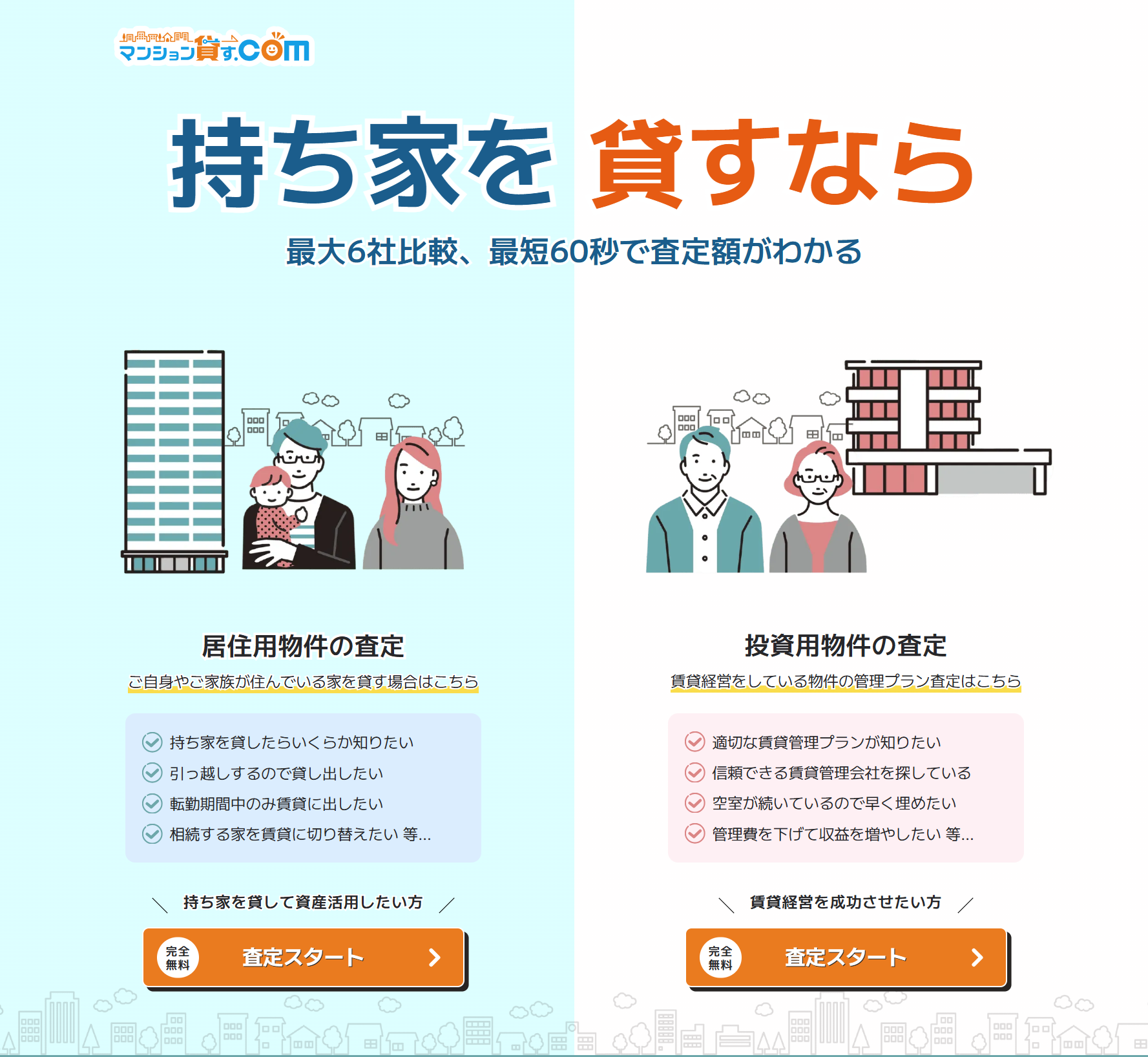 賃貸管理一括査定サービス「マンション貸す.com」は、チャット形式の簡単な質問に答えるだけで、不動産会社を最大6社まで一括で比較できるプラットフォームです。