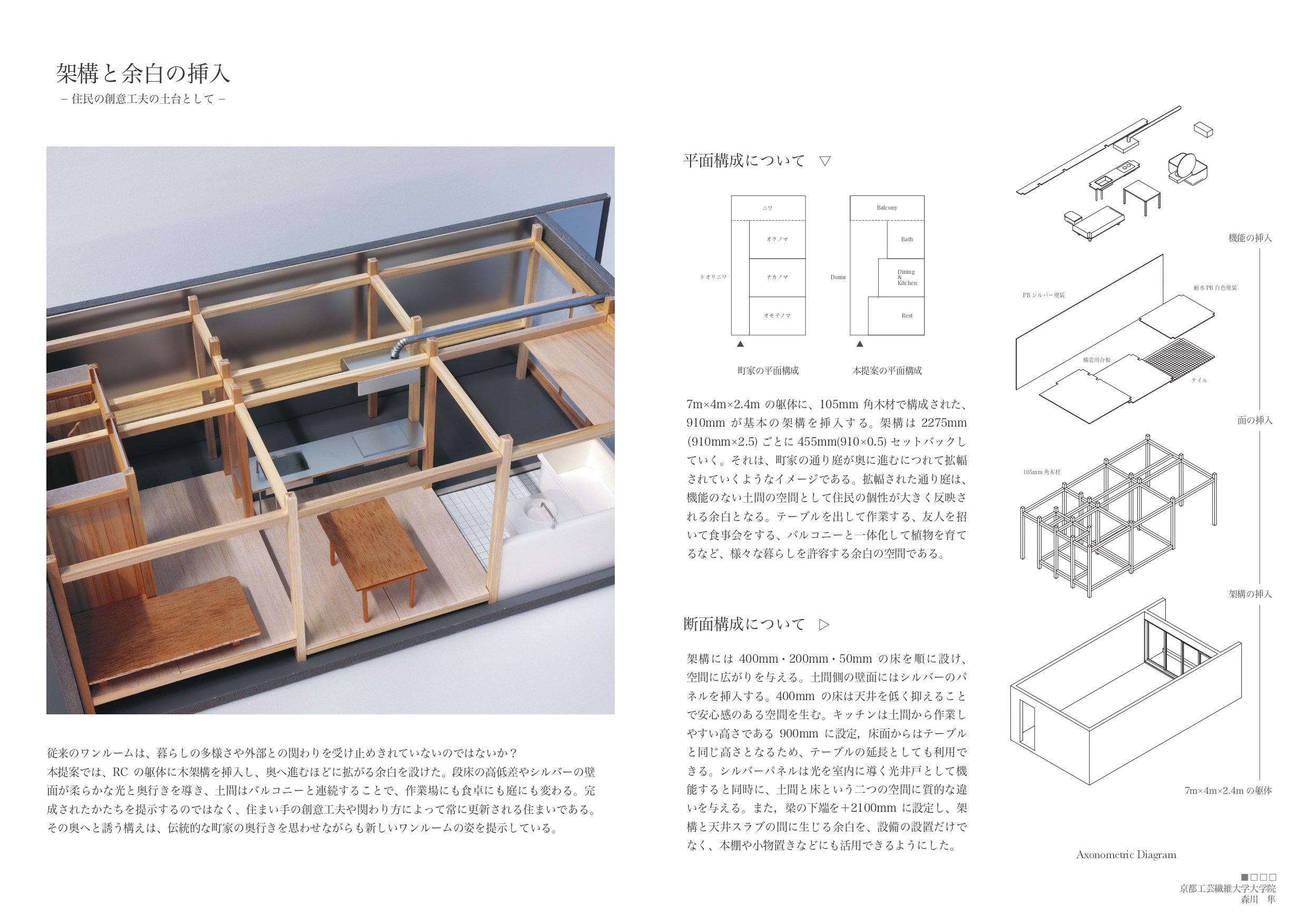 従来のワンルームは、暮らしの多様さや外部との関わりを受け止めきれていないのではないか? 本提案ではRCの躯体に木架構をずらしながら挿入することで、奥へ進むほどに拡がる土間を設けた。段床の高低差やシルバーの壁面が柔らかな光を導き、奥行きを生み出す。土間はバルコニーと連続することで、作業場にも食卓にも庭にも変わる。挿入された木架構によって、使い方が定義されない様々な余白がワンルームに生まれる。完成されたかたちを提示するのではなく、住まい手の創意工夫や関わり方によって常に更新される住まいである。その奥へと誘う構えは、伝統的な町家の奥行きを思わせながらも新しいワンルームの姿を提示している。