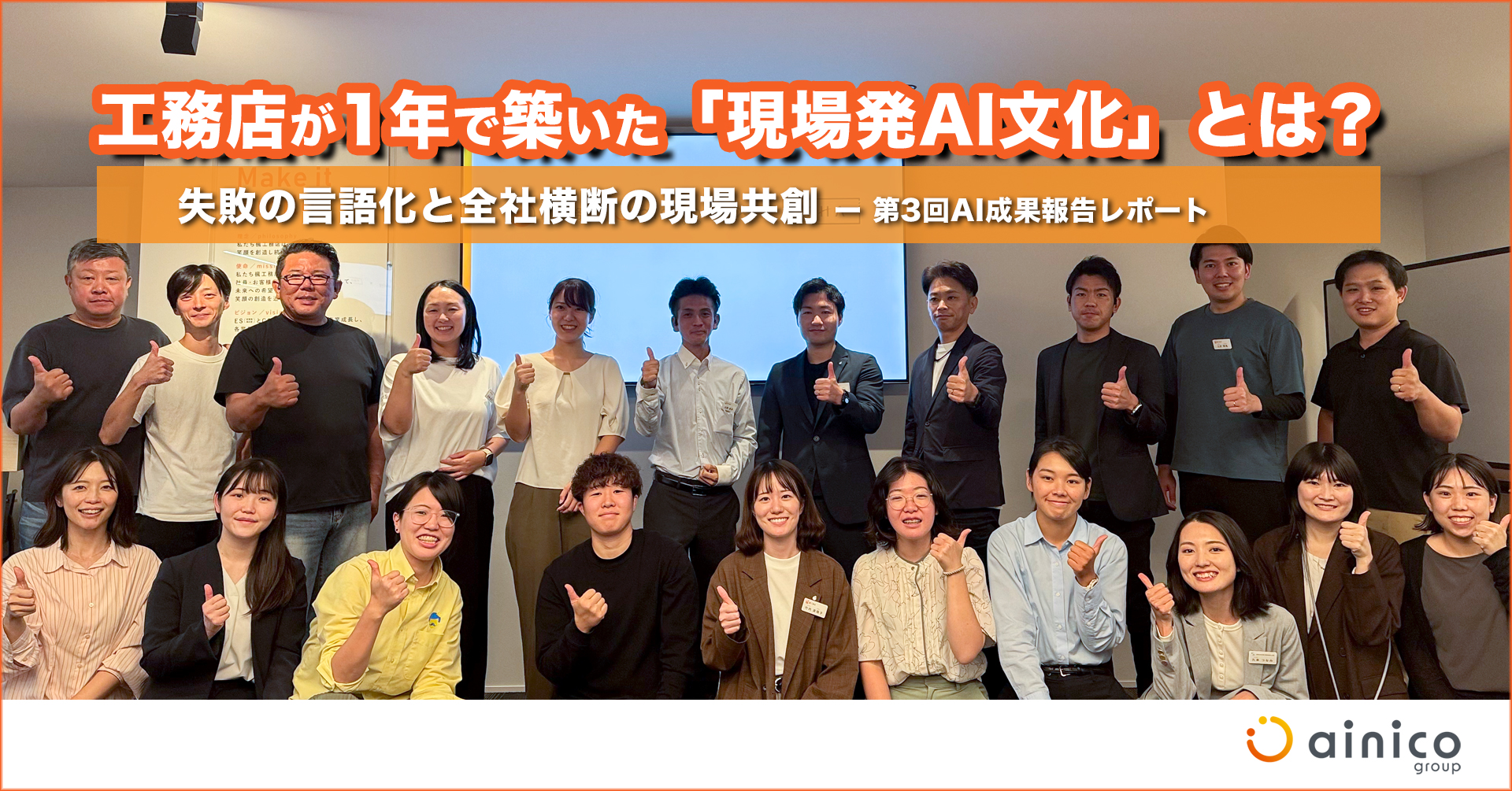 奈良・京都南部を中心に注文住宅事業「楓工務店」や不動産事業「トチナラ」などを展開するアイニコグループ株式会社(本社:奈良県奈良市、代表者:田尻 忠義、以下当社)は、各事業部でのAI活用プロジェクトの成果を報告する第3回AI成果報告会を開催しました。不動産・介護・設計など全10部門が、資金計画の自動化や図面差分抽出アプリ開発、介護対話支援ボット構築といった現場発案の具体的な成果を発表。部門によっては年間1,368時間の業務削減(広報企画部)に繋がったことも報告されました。