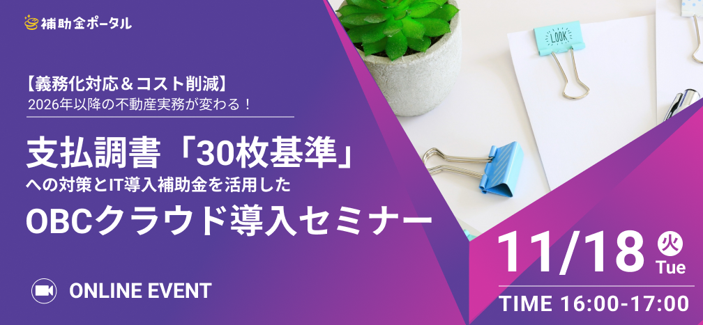 株式会社補助金ポータル(本社:東京都渋谷区、代表取締役:福井彰次)はイノテックスビジネスソリューションズ株式会社(本社:東京都港区、代表取締役社長 榎本一郎)と株式会社オービックビジネスコンサルタント(本社:東京都新宿区、代表取締役社長 和田成史)と共同で「【義務化対応&コスト削減】2026年以降の不動産実務が変わる! 支払調書「30枚基準」への対策と IT導入補助金を活用したOBCクラウド導入セミナー」をテーマにした無料オンラインセミナーを2025年11月18日(火)16時より開催いたします。Zoomでどなたでもお気軽にご視聴いただけますので、ぜひご参加くださいませ。