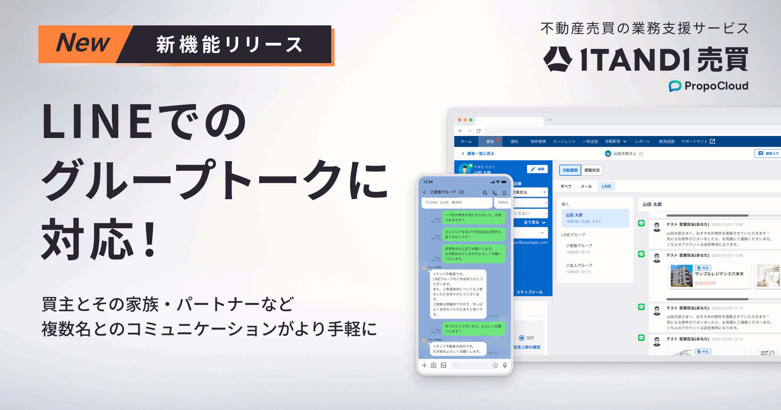 テクノロジーで不動産取引をなめらかにするイタンジ株式会社(以下「当社」)は、2025年10月より、不動産売買の業務支援サービス「ITANDI 売買 PropoCloud」の追客支援システムに、「LINEでのグループトーク」に対応した新機能(以下「本機能」)を追加しました。