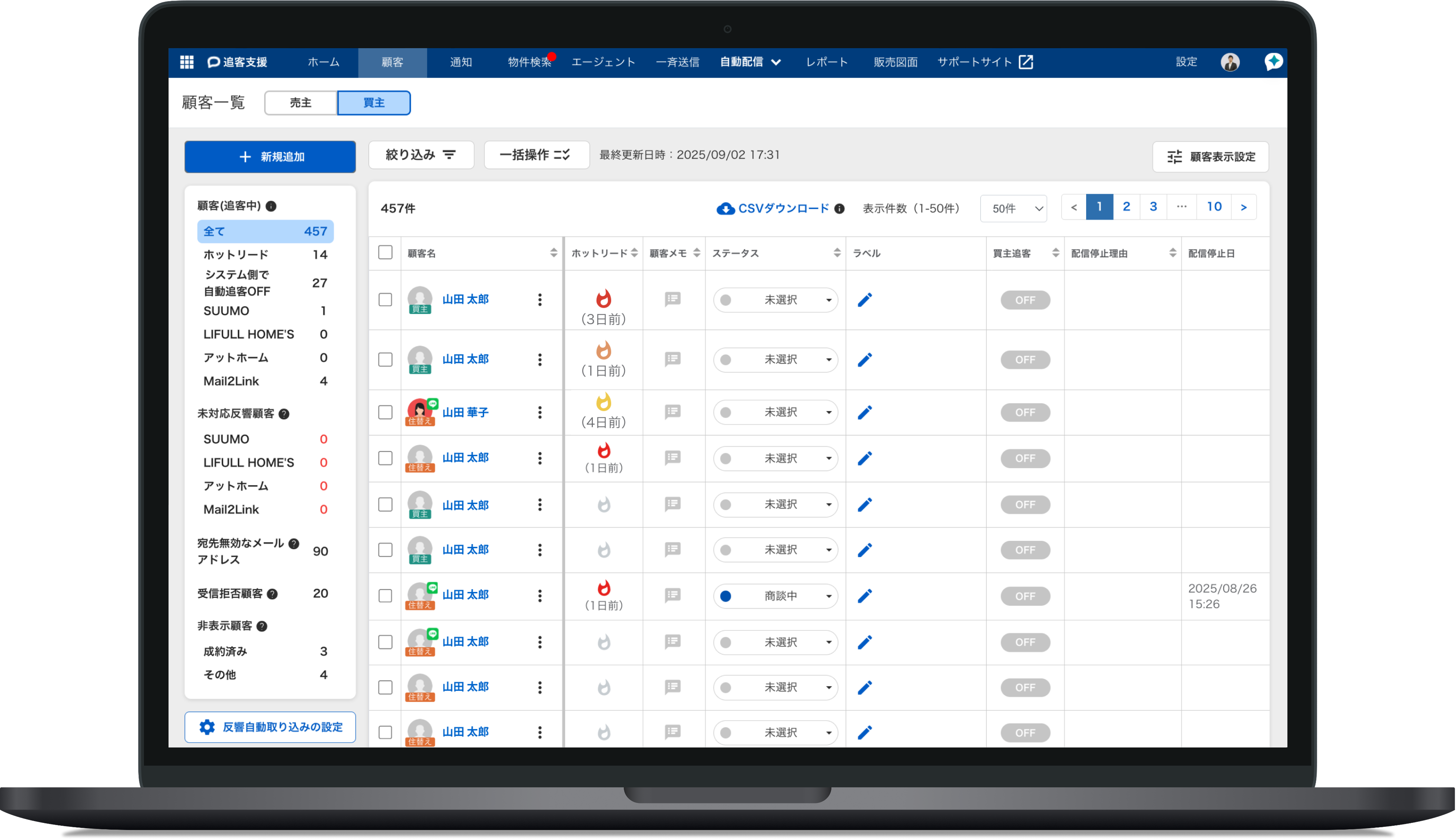 買主の希望条件に合った物件情報や売主の売却物件に合ったコンテンツの自動メール送信、販売図面の自動帯替え、価格変更の検知、状況報告の効率化など、不動産売買の営業活動に必要な各種機能を備え、業務効率化と顧客満足度の向上に貢献します。AI⽂章⽣成機能により、買主へは提案したい物件を選択するだけで物件概要などを含んだ提案⽂を、売主へは保有する物件の周辺の売り出し事例を紹介する文章を、自動生成することが可能です。
