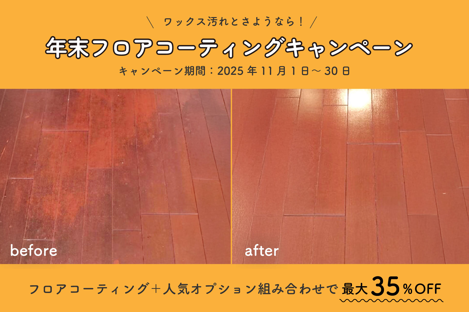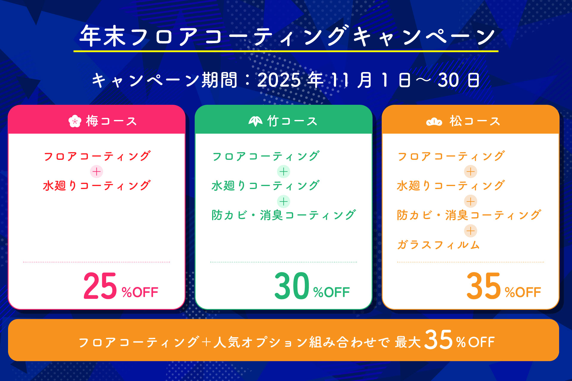 割引内容:フロアコーティングとその他オプションサービス(水廻りコーティング、防カビ・消臭コーティング)を組み合わせることで、最大35%OFFの特別価格でご提供します。