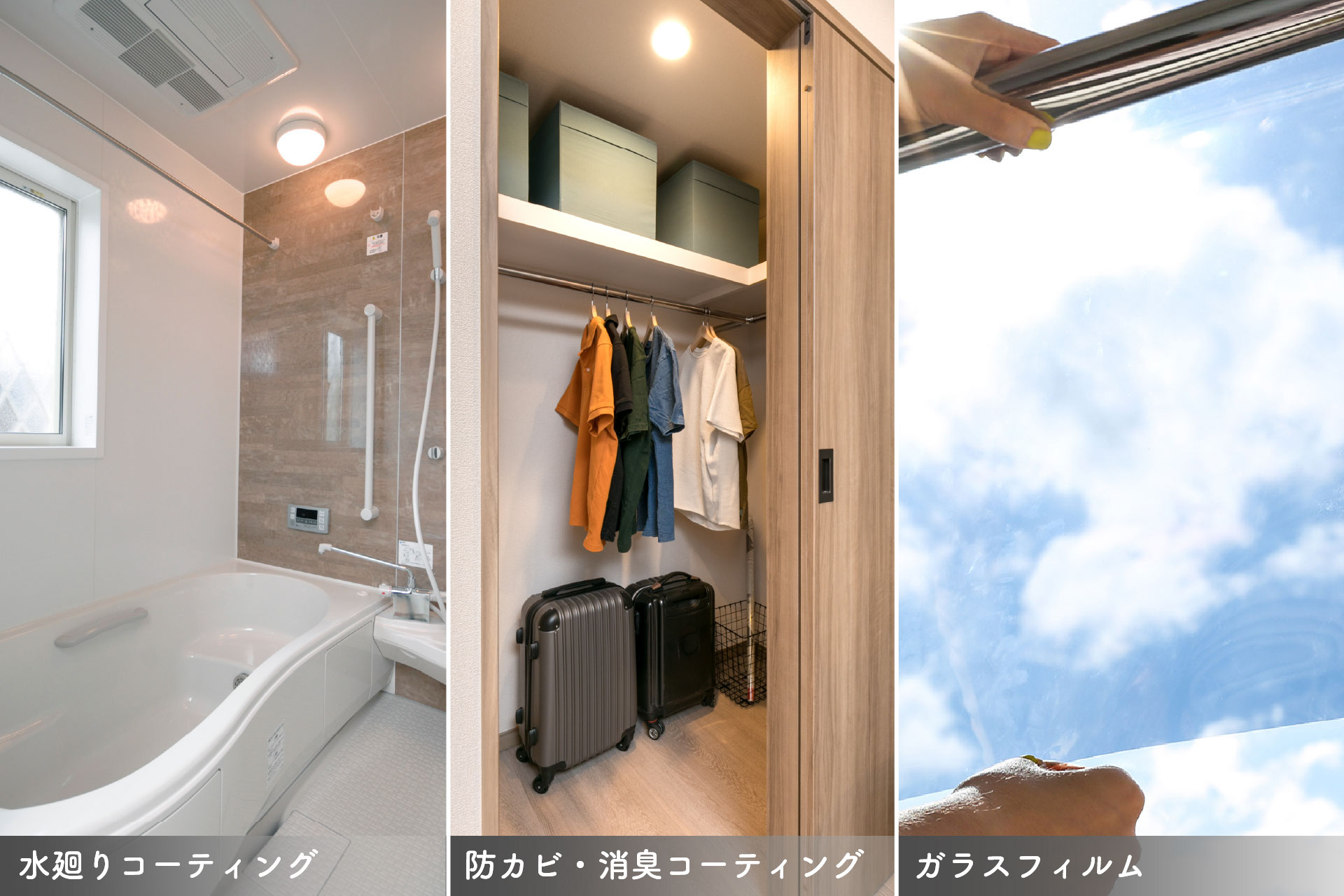 水垢やカビ発生を防ぎ、お手入れの手間を減らします。キッチン、浴室、トイレ、洗面所などへの施工がおすすめです。