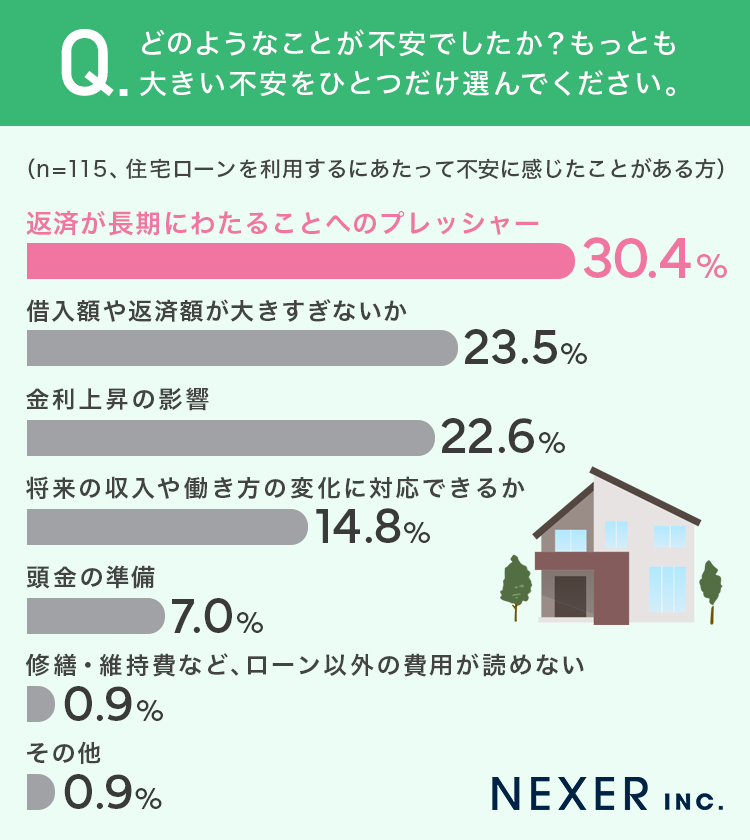 30.4%が「返済が長期にわたることへのプレッシャー」、23.5%が「借入額や返済額が大きすぎないか」、22.6%が「金利上昇の影響」と回答しました。