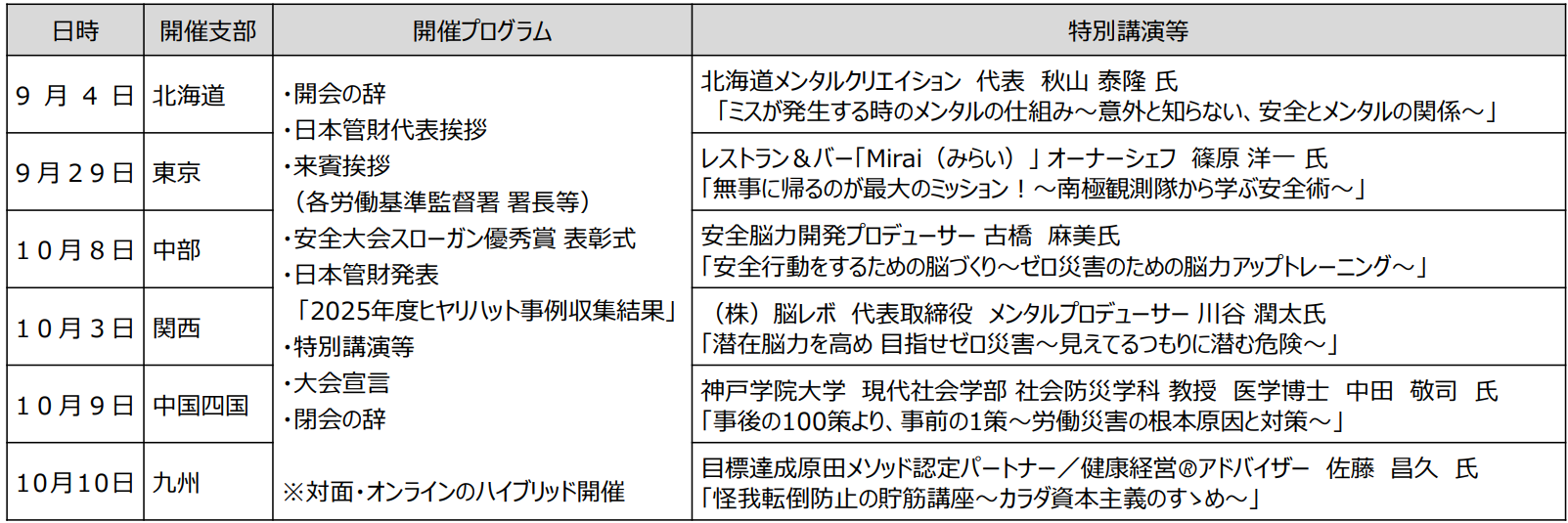 オフィスビルや商業施設等の建物管理運営事業や住宅管理運営事業、不動産ファンドマネジメント事業等を手掛ける日本管財ホールディングス株式会社(本社:東京都中央区、代表取締役社長:福田 慎太郎、以下「当社」)は、グループ会社の日本管財株式会社が事務局をつとめる日本管財安全衛生協力会が、2025年9月4日から2025年10月10日に全国6支部で安全大会を開催したことをお知らせいたします。