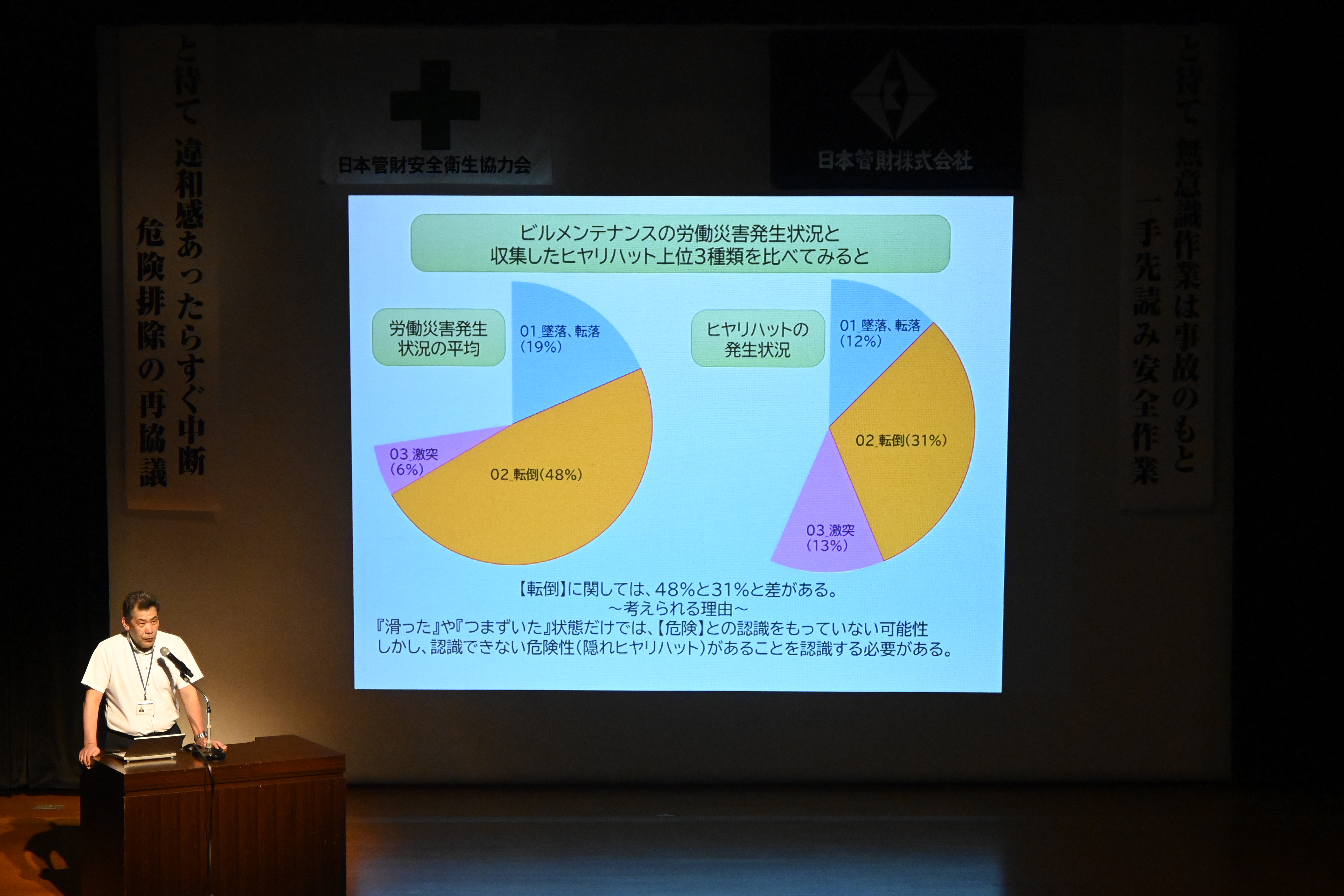 中央労働基準監督署署長による来賓挨拶では、2つの心理的効果を例に、「安全を意識することで、現場の危険やリスクに気づきやすくなる」、「安全は他人事ではなく自分事として考えるべき」とお話いただきました。その他、本安全大会のスローガン優秀賞受賞者への表彰式や、会員企業により収集したヒヤリハット事例の結果報告、特別講演を行いました。