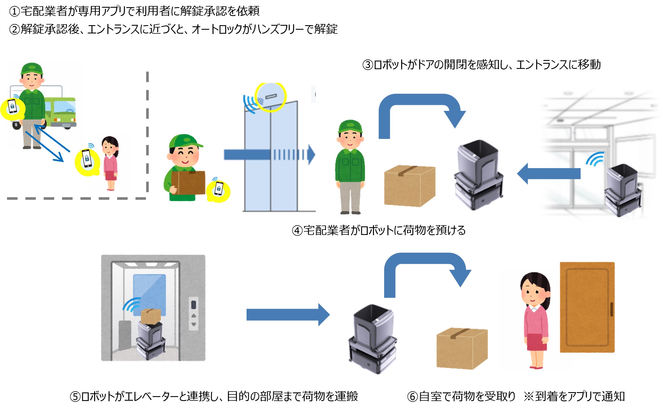 この取り組みは、スマートフォンを活用して荷物を自室まで自動で配送する仕組みを検証します。宅配業界の人手不足や再配達問題等の課題解決にもつながることが期待されています。