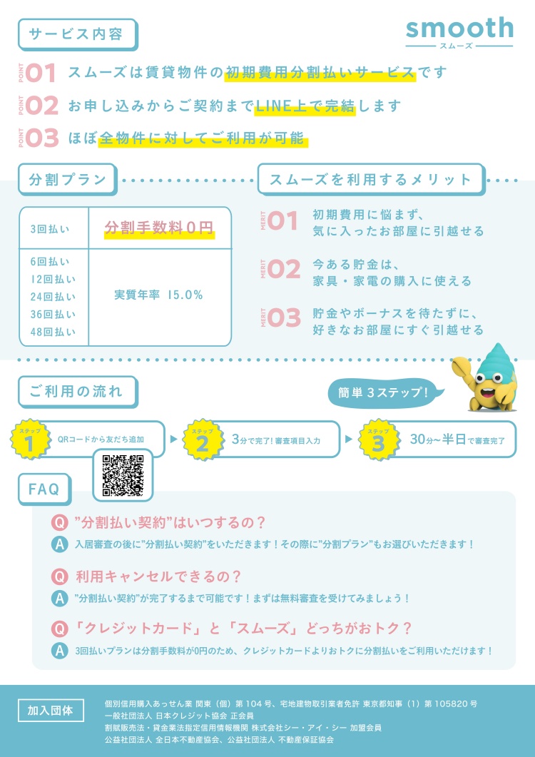 「スムーズ」は、引っ越し時にかかる初期費用をお客様に代わって立替払いするサービスです。