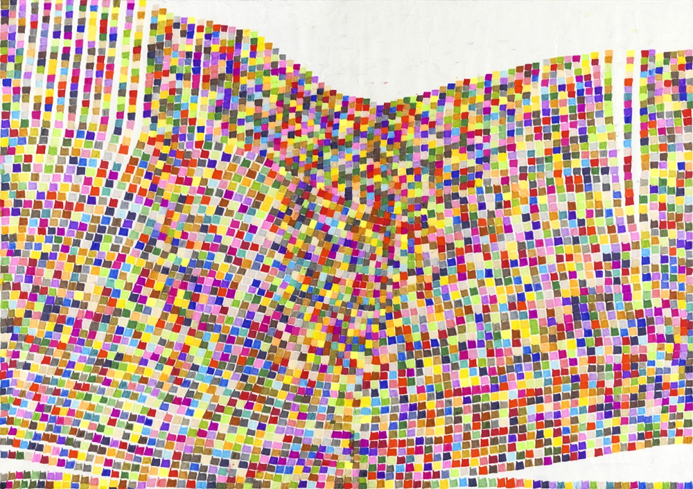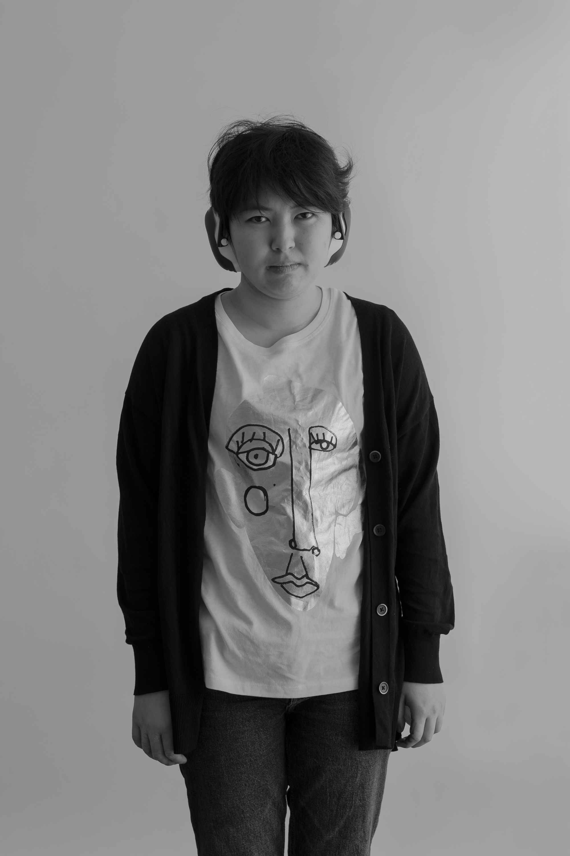 学校に行けず暇を持て余していた時期に、作家の母が「マルを描いて」と紙とペンを渡したのが創作のはじまり。マルというモチーフが彼女のなかでピタリとはまり熱中するようになる。マルを描き始めて5年になるが、近年はマル以外のモチーフも描くようになり、マル、サンカク、シカクのモチーフを大きなカンバスに日々飽きることなく描き続ける。コミュニケーションとして発する言葉はわずかだが、頭に浮かんだであろう言葉を繰り返し呟き、言葉と一緒に作品が生まれることもある。