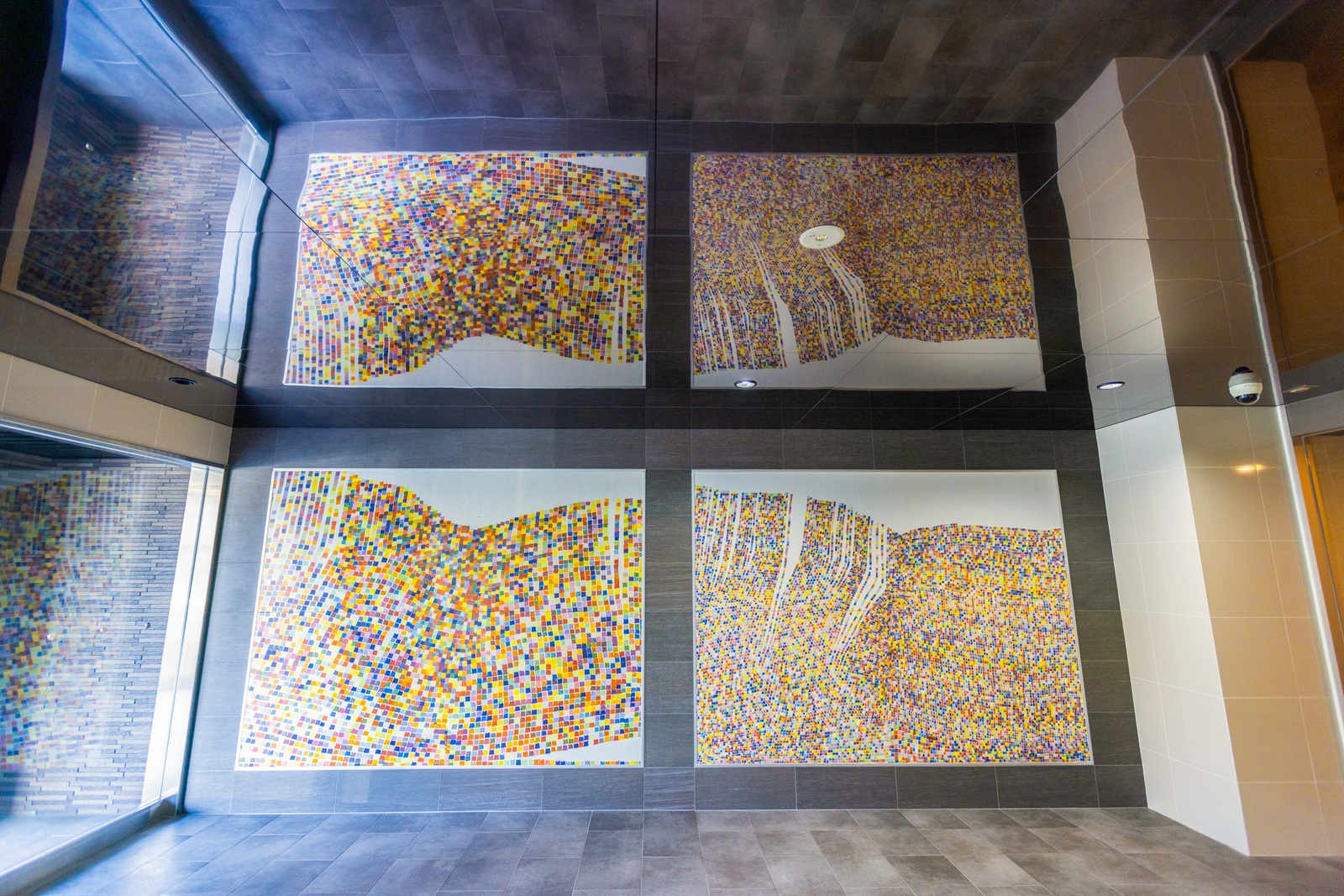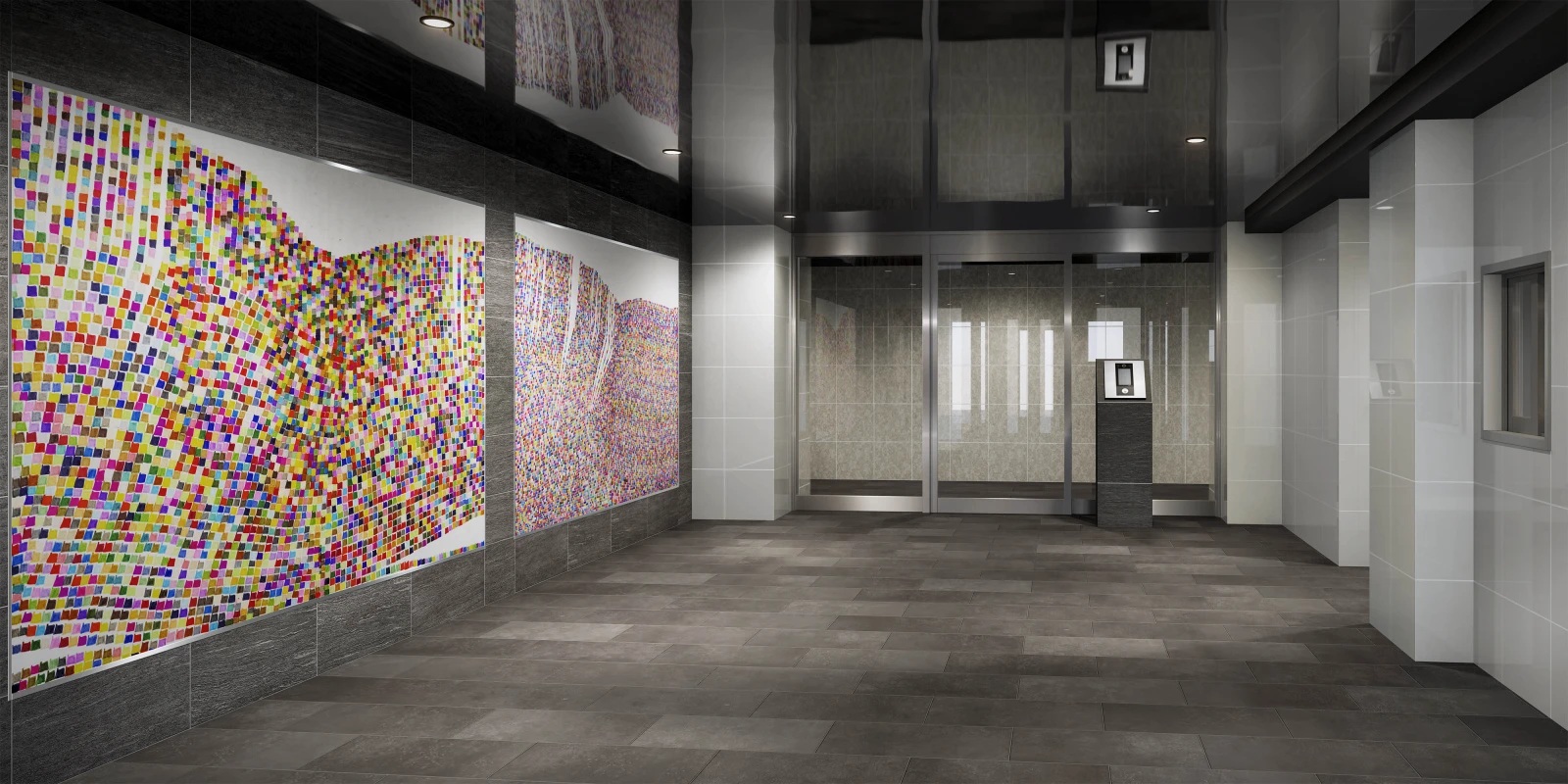 エントランスホールには、アースカラーの落ち着いた空間の中に面アートを配置し、建築とアートを融合。