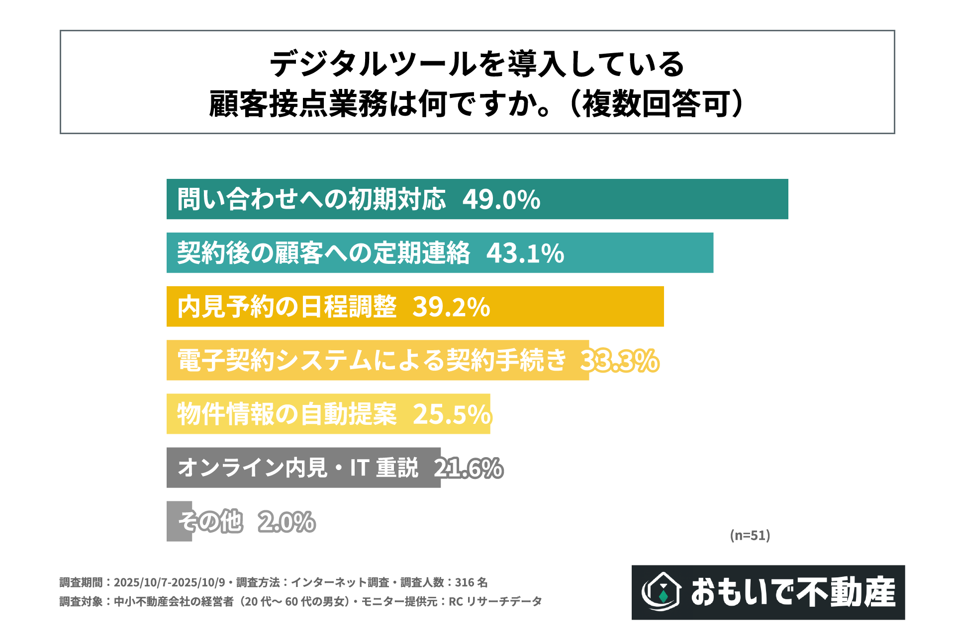 続いて、自社の顧客接点業務において、何らかのデジタルツールを導入していると回答した人を対象に「デジタルツールを導入している顧客接点業務は何か」を尋ねる設問への回答では、1位が「問い合わせへの初期対応」で49.0%、2位が「契約後の顧客への定期連絡」で43.1%、3位が「内見予約の日程調整」で39.2%という結果になりました。この結果から、顧客接点業務において何らかのデジタルツールを導入している中小不動産会社が、デジタルツールを導入している業務で最も多いのは「問い合わせへの初期対応」であることが判明しました。