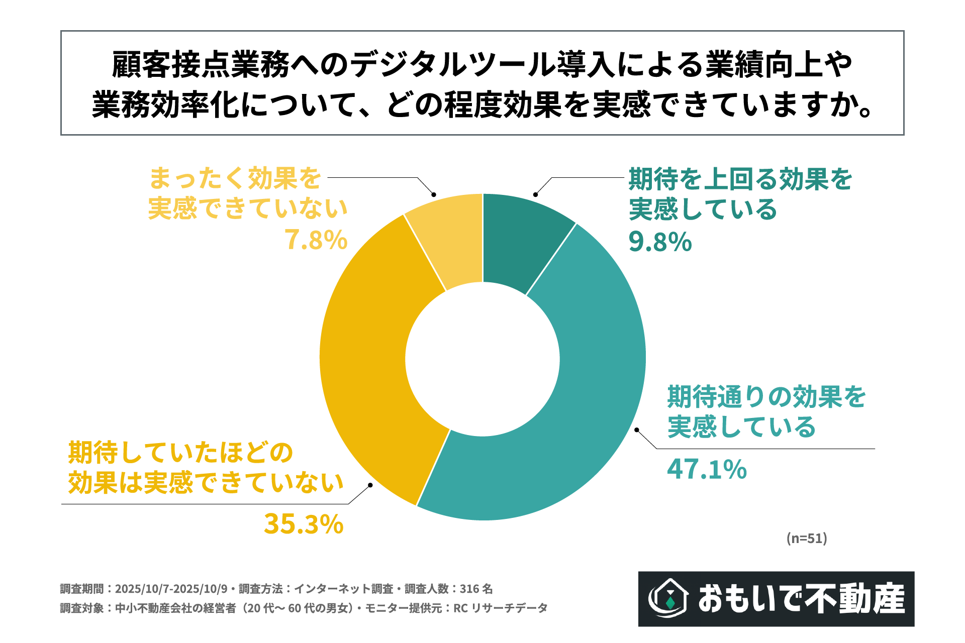 顧客接点業務において何らかのデジタルツールを導入している中小不動産会社の経営者の4割強が、デジタルツール導入による業績向上や業務効率化について「期待していた効果を実感できていない」と回答
