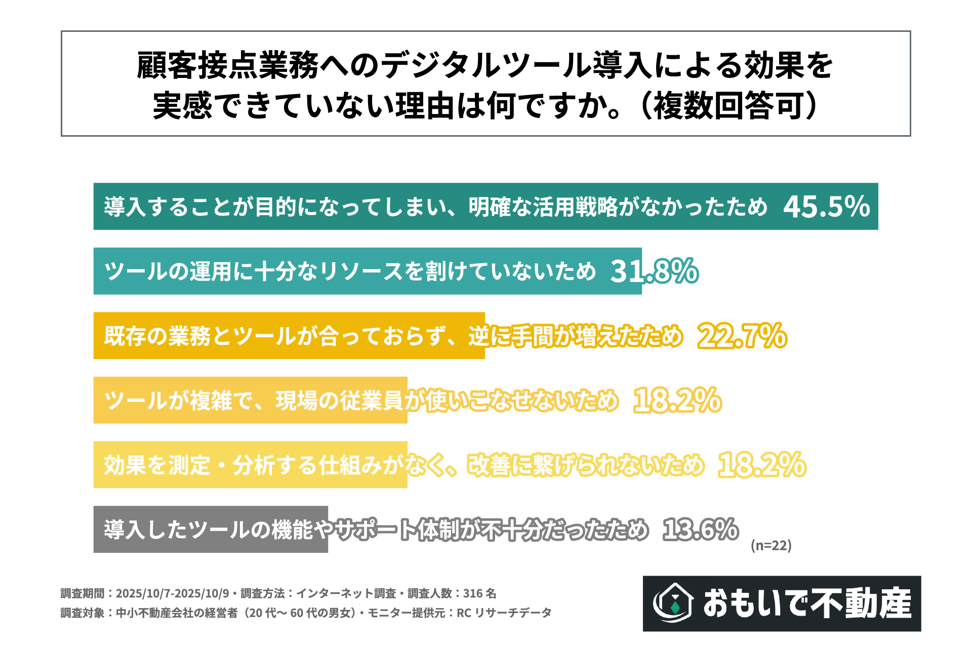 ・顧客接点業務において何らかのデジタルツールを導入している中小不動産会社の経営者の4割強が、デジタルツール導入による業績向上や業務効率化について「期待していた効果を実感できていない」と回答
