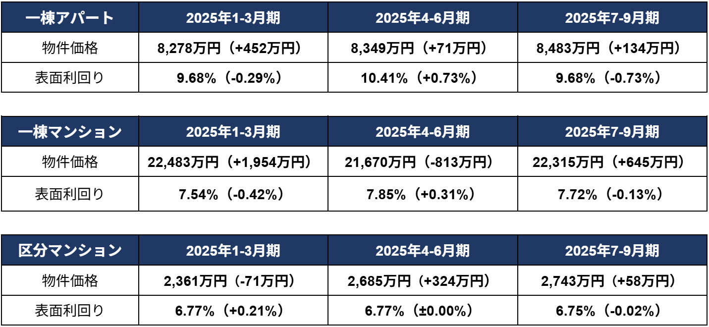 前四半期(2025年4-6月期)に続き、一棟アパート・区分マンションともに過去最高額を更新しました。一棟マンションにおいても、2025年1-3月期に記録した過去最高額2億2483万円に迫る、2億2315万円まで上昇しています。
