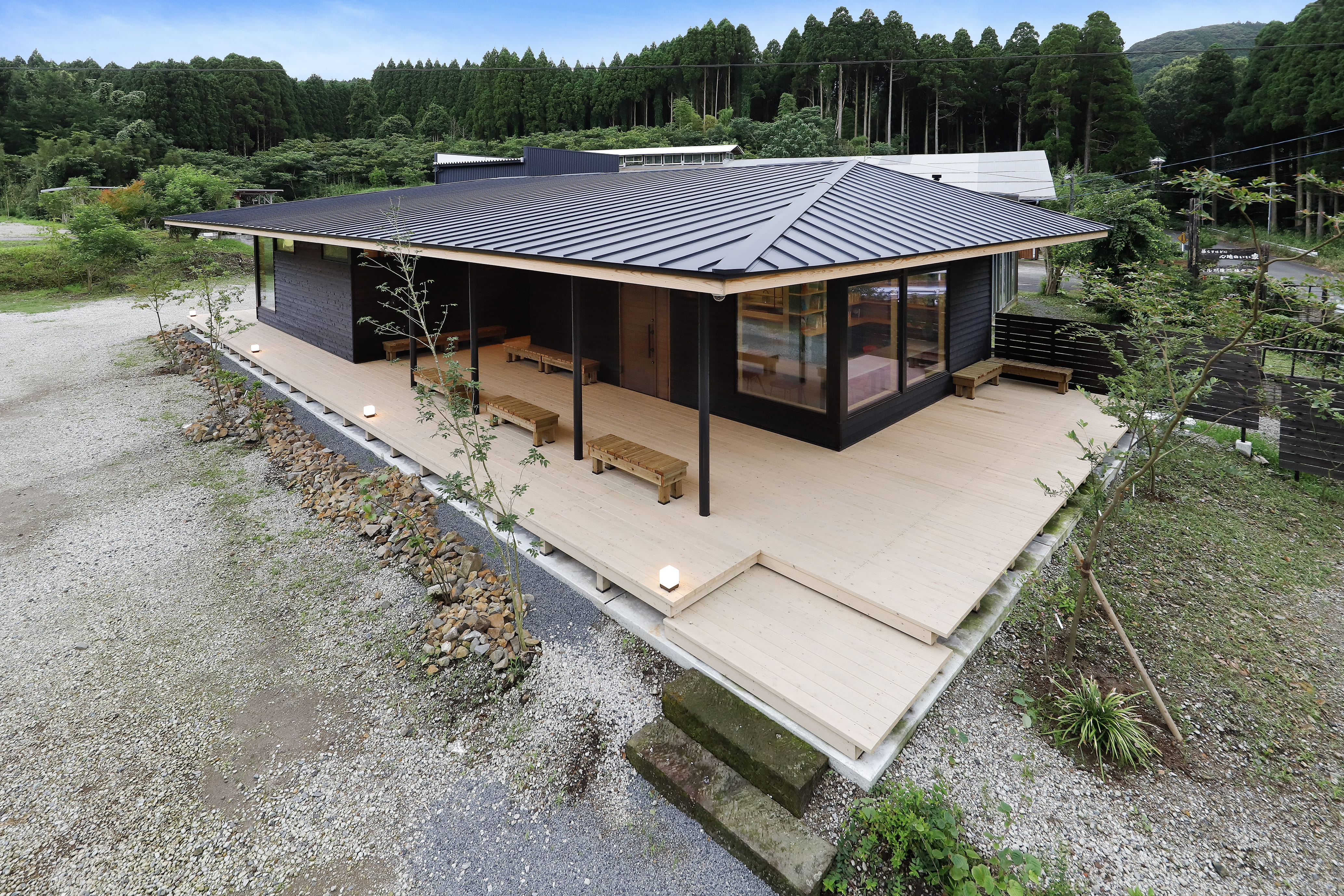 光を吸い込み、山の緑や空の青を映すその外壁は、まるで自然の一部のように風景に溶け込みながら、凛とした存在感を放っています。
