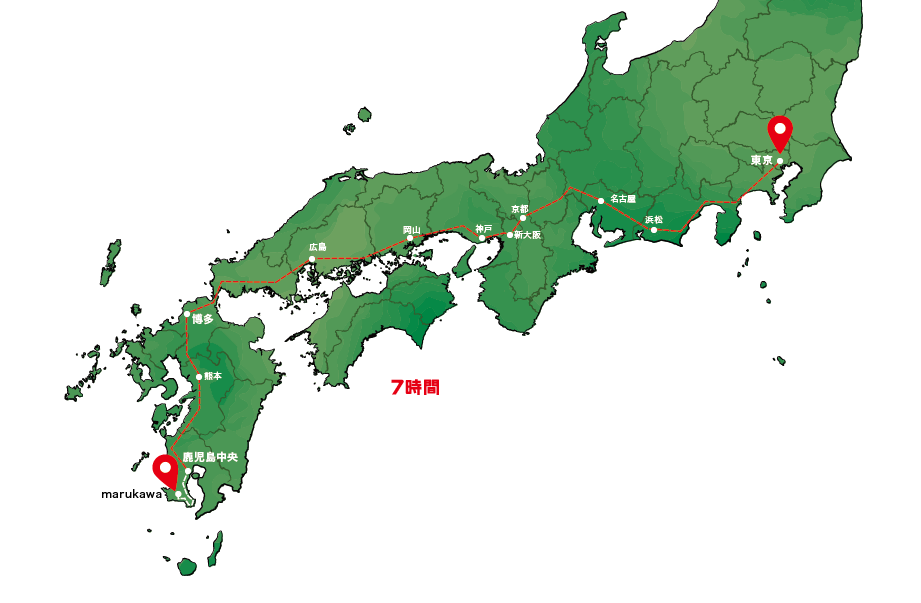 東海道新幹線で新大阪や博多を経由し、鹿児島中央駅へ。