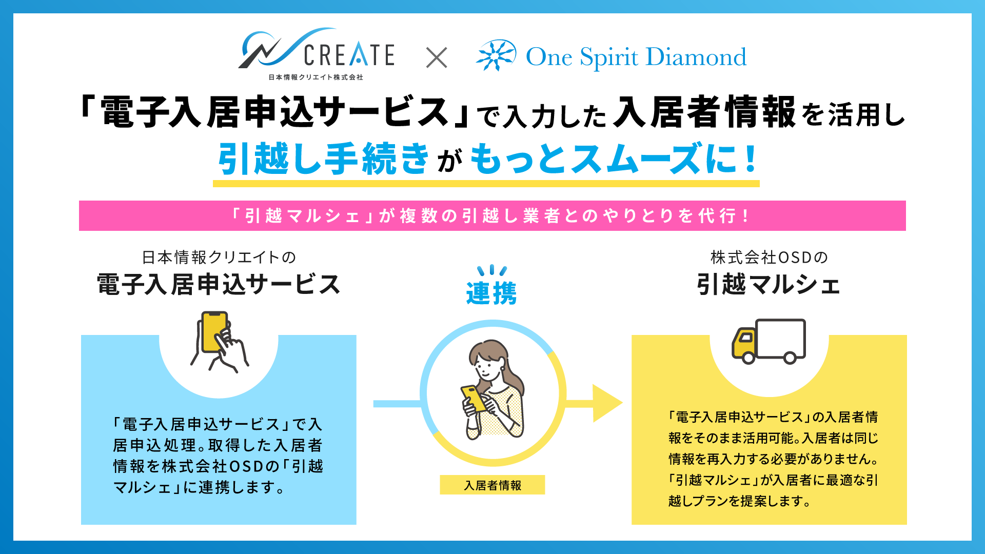 不動産テックを推進する日本情報クリエイト株式会社(本社:宮崎県都城市、代表取締役社長:辻村 都雄、証券コード:4054)と株式会社OSD(本社:東京都江東区、代表取締役社長:ドッズ オスカー昴、以下「OSD」)は、日本情報クリエイトが提供する「電子入居申込サービス」とOSDの次世代型引越し見積りサービス「引越マルシェ」を連携させ、入居者がスムーズに引越し手続きを完了できる新たなサービス提供を開始します。