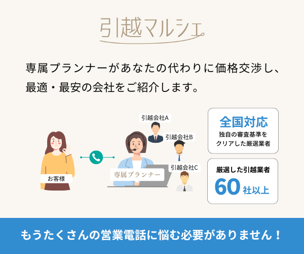 「引越マルシェ」は、専任の引越プランナーが、選択肢が多く煩雑な「引越し」について丁寧にご説明をし、全国各地60社以上の引越会社との提携を活かして、お客様にあった最適な引越プランをご提案すると共に、引越に伴い発生する煩雑な事務作業をサポート、代行をさせて頂くサービスです。