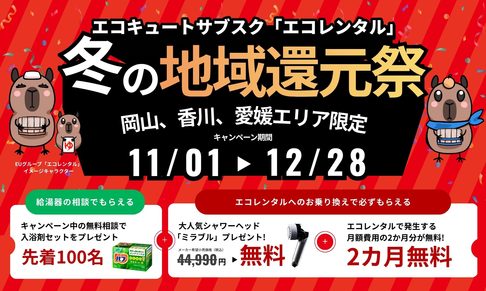 中四国地方でエコキュートのサブスク「エコレンタル」を展開するEUグループ株式会社(本社:岡山県倉敷市、代表:河合 雄治)は、地元のお客様へ感謝の意を込めて、「冬の地域還元祭キャンペーン」を2025年11月1日より開始いたします。本キャンペーンは、当社が運営する給湯器事業を多くのお客様にご利用いただくことを目的としており、2025年12月28日までの期間限定で特別な優待をご用意しております。