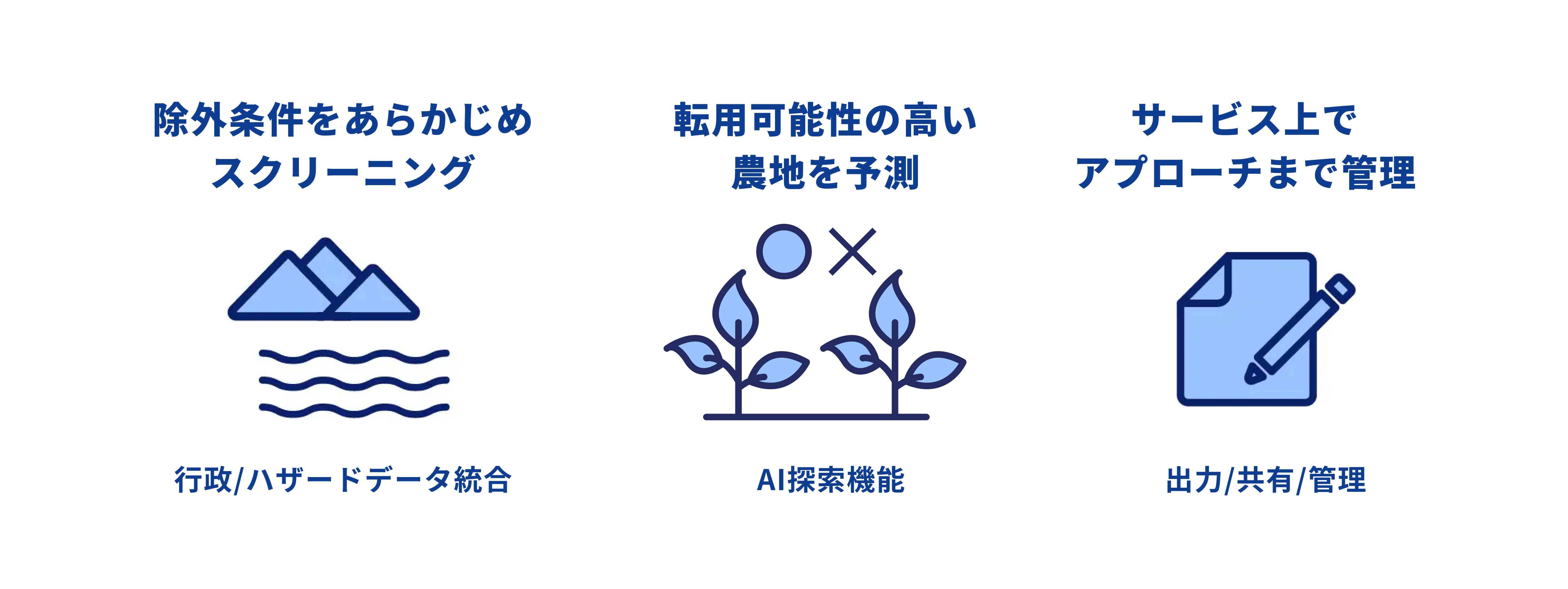 ・AI探索機能:農地区分や災害リスクを考慮した候補地自動抽出