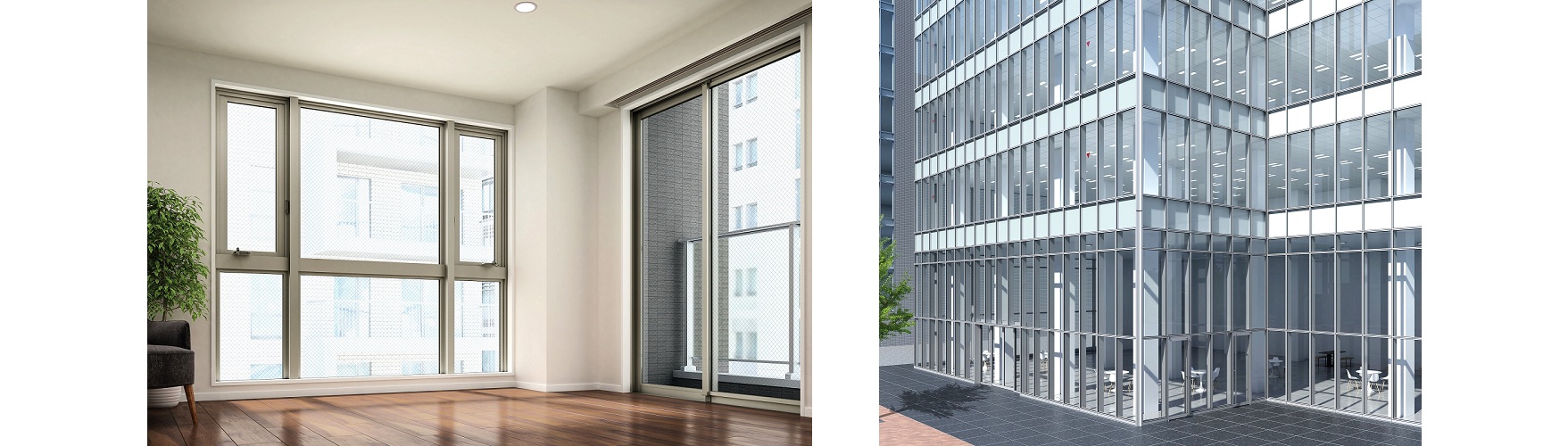 そしてこの度、新地金を使用せず100%リサイクルアルミを使用することで、新地金を製錬する際のエネルギー消費を抑えた「Re・AL」を使った物件対応を開始します。「Re・AL」は第三者検証の環境製品宣言「SuMPO EPD」を取得(※)しており、既存の弊社商品に比べて原材料調達・輸送・製造に至るまでのライフサイクルを通したCO₂排出量を73%削減することが可能です。建築物の環境価値の向上に優先的に取り組む建材や自社商材を中心に、非木造建築向けビル用商品(窓、カーテンウォール)の受注生産対応からスタートしていきます。