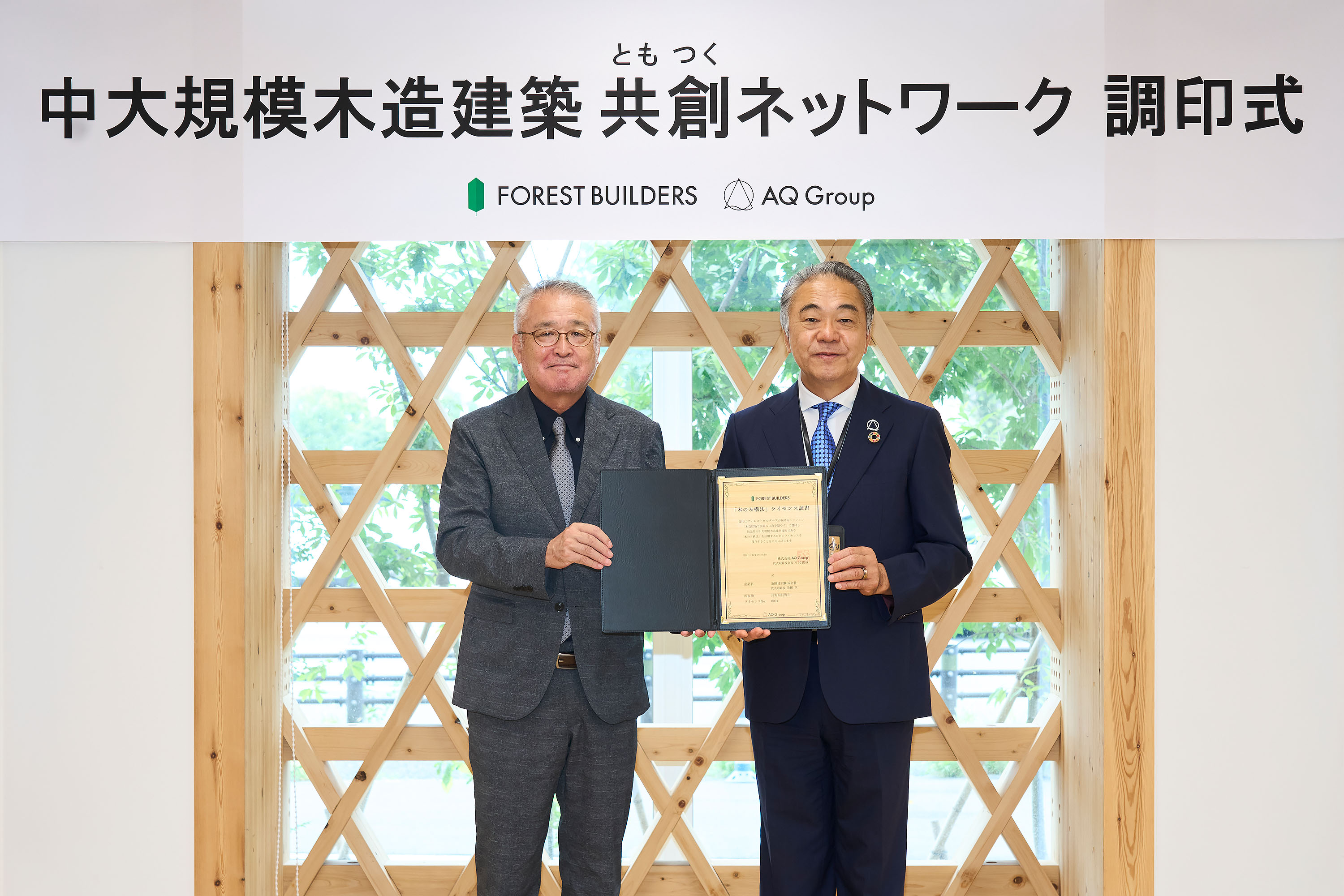 弊社は今年9月に、純木造のオフィスビルやマンション、大型倉庫などの建築を手掛ける組織として「中大規模木造建築 共創〈ともつく〉ネットワーク(通称:ともつくネット)」を設立。加盟企業に、弊社と木質構造の第一人者として知られる東京大学名誉教授 稲山正弘氏が共同開発した最先端技術「AQ木のみ構法」をライセンス提供し、47の各都道府県に、中大規模木造建築を普及させていくためのプロジェクトを進行しています。