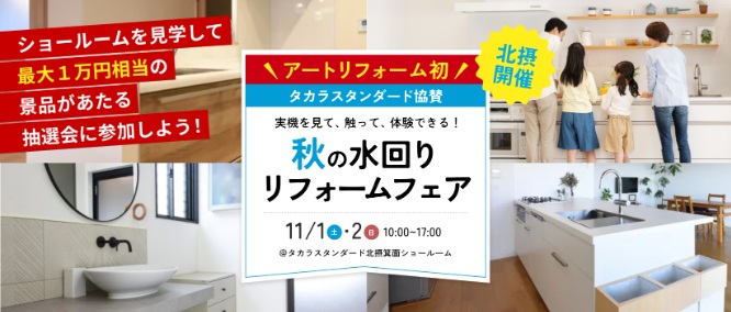 全国でリフォーム・リノベーション工事を年間6,500件以上手がける株式会社アートリフォーム(本社:大阪府吹田市、代表者:代表取締役社長 大本哲也、以下「アートリフォーム」)は、タカラスタンダード協賛、「実機を見て、触って、体験できる!アートリフォーム秋の水回りリフォームフェア」を2025年11月1日(土)~2日(日)に、タカラスタンダード北摂ショールーム(大阪府箕面市稲)にて開催します。タカラスタンダード社との共同開催イベントは今回が初の取組みとなります。