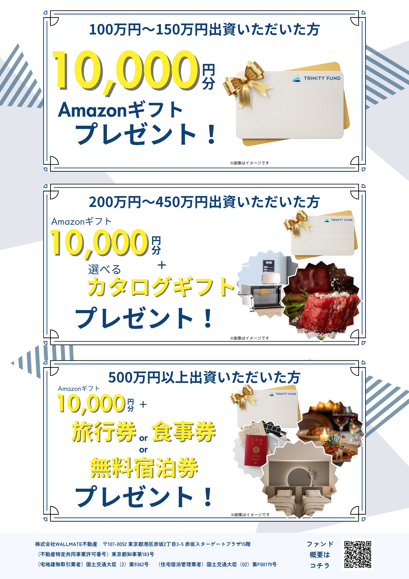 The Meguro Luxury Fund(TRINITY FUND 4号)へ以下内容にてご出資いただいた方全員に、アマゾンギフト(以下、アマギフ)や選べるカタログギフトをプレゼントいたします!