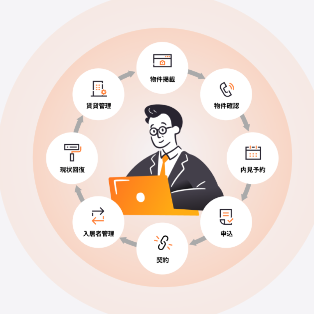 不動産賃貸管理会社向けの業務支援サービスです。物件検索から内見予約、入居申込、賃貸借契約、入居者管理、更新退去手続き、原状回復工事までの一連の業務をテクノロジーで支援し、業務効率化と顧客満足度向上を実現し、不動産業界のペーパーレス化に貢献しています。また、オーナー満足度を向上させる不動産基幹システムとして、精算管理、物件管理、家主管理などの業務支援が可能です。