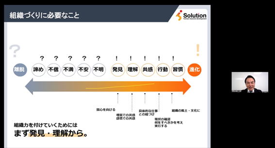 信頼関係を構築し、社員が持つ「不明」「不安」「不満」を解消していくことが重要であり、
