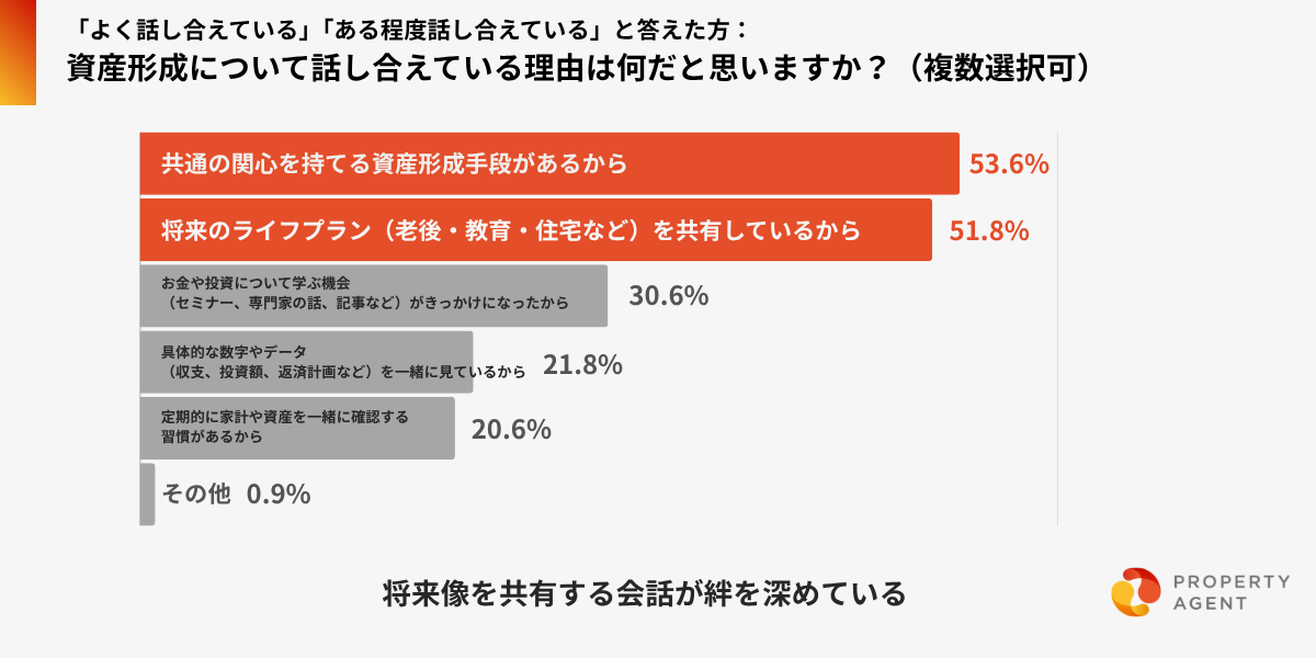 資産形成について話し合っている夫婦のうち、94.8%が「夫婦関係に良い影響を感じる」と回答しました。話し合えている理由として、「共通の関心を持てる資産形成手段がある」(53.6%)、「将来のライフプランを共有している」(51.8%)など、将来像を共有する会話が絆を深めていることがうかがえます。