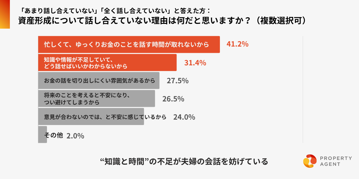 次いで「知識や情報が不足していて、どう話せばいいかわからない」(31.4%)、「お金の話を切り出しにくい雰囲気がある」(27.5%)が続き、“知識と時間”の不足が夫婦の会話を妨げている現状が見えてきました。
