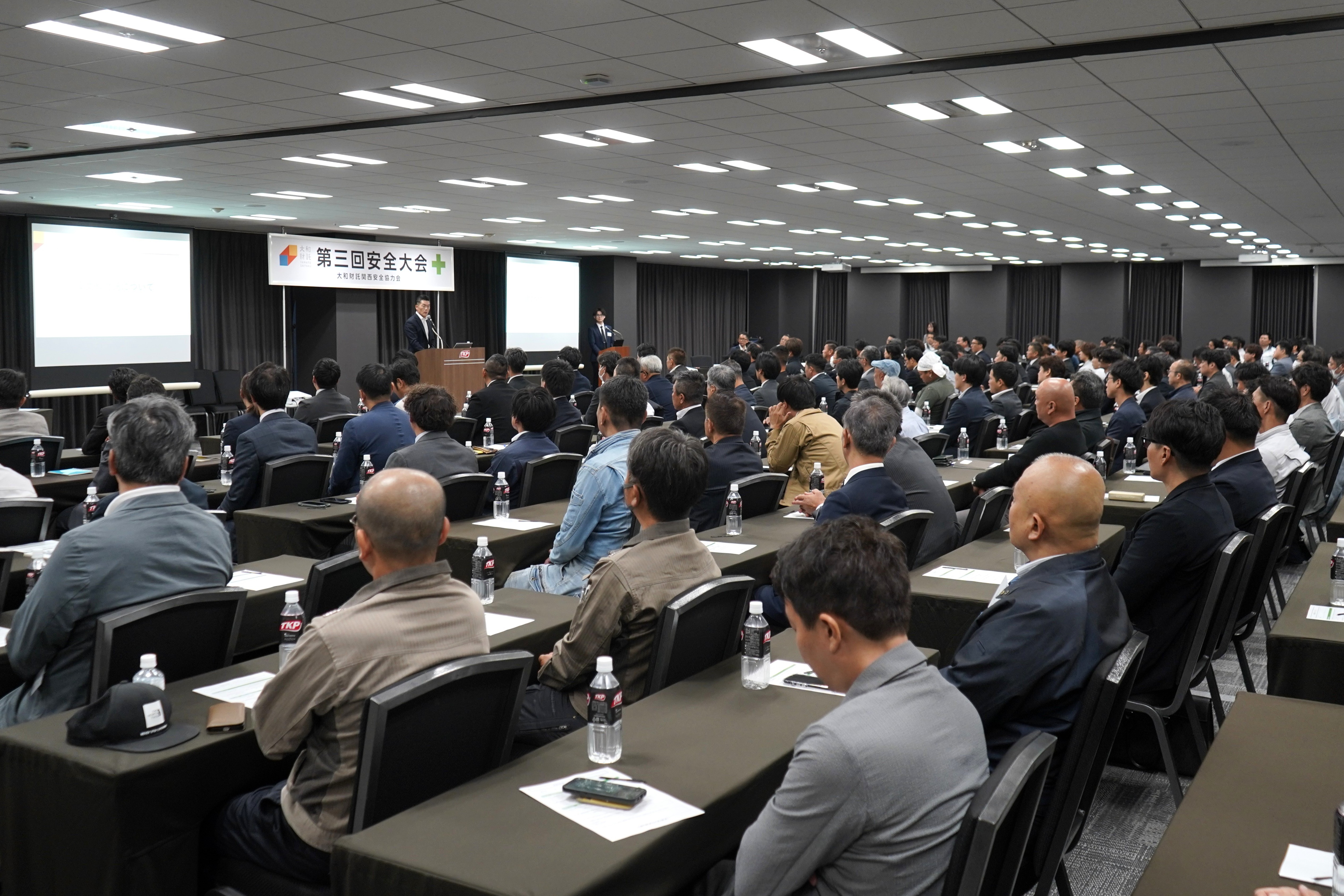 安全大会は、建築現場の作業員を事故や災害から守るため、作業員の安全や健康についての理解を深めることを目的に、協力会社関係者などを招いて開催される集会です。労働災害・交通災害を未然に防ぐために何をすべきかを考え、現場全体と作業員の安全意識を高めることを目的としています。